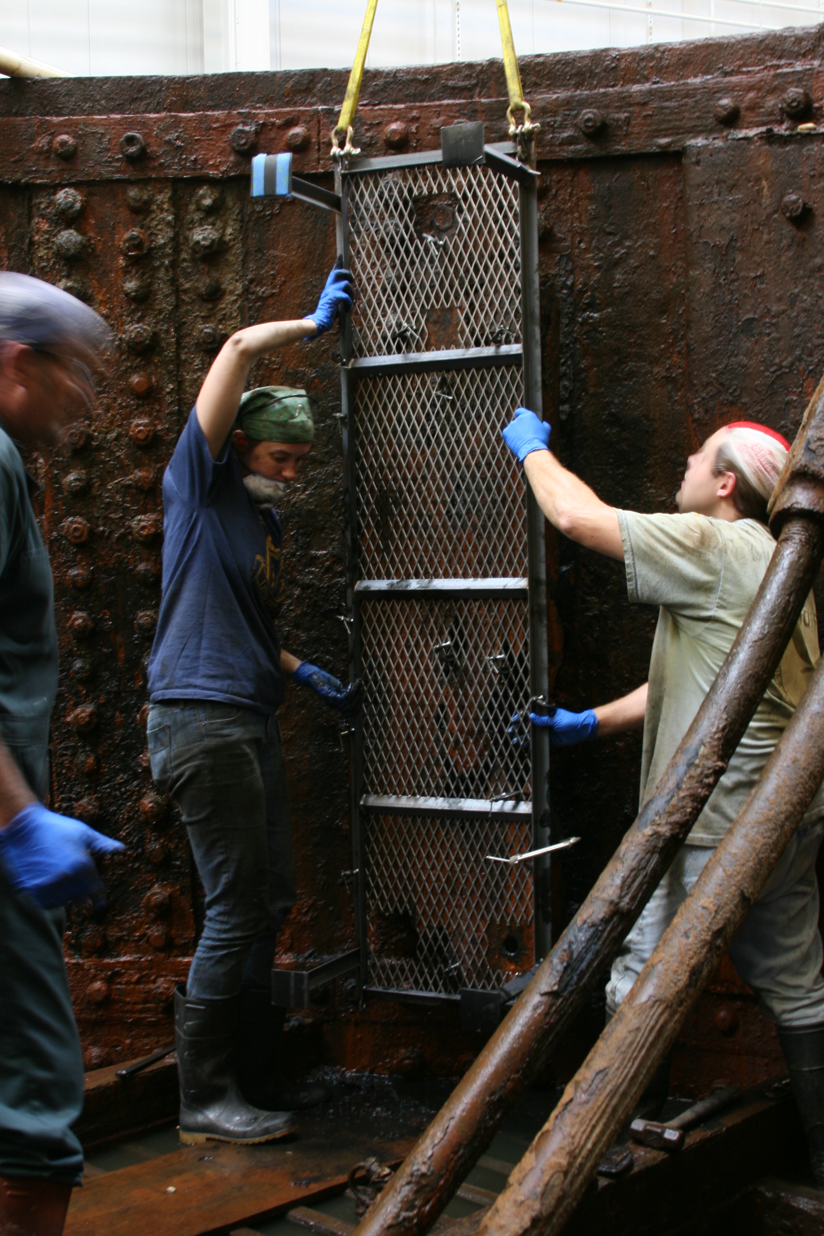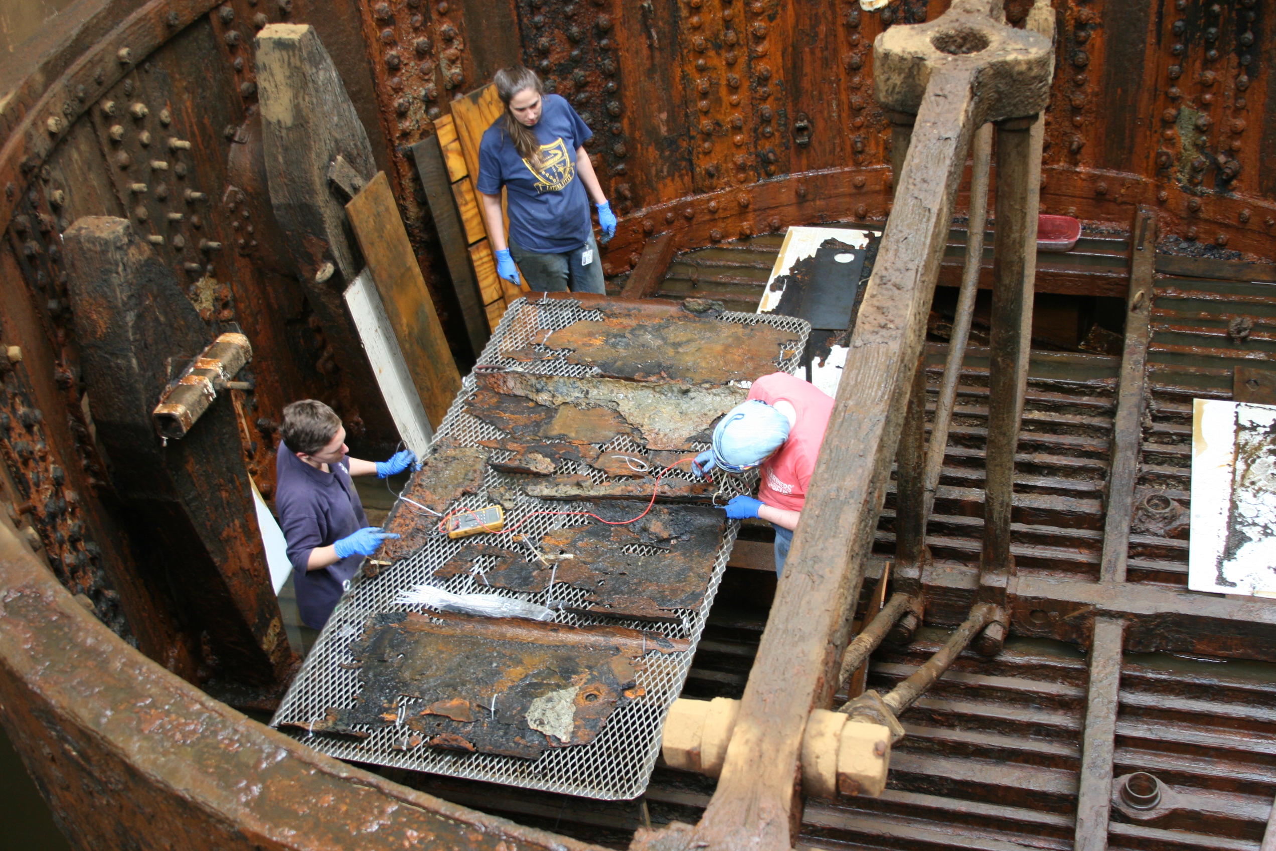 While Lesley, Kate and I worked inside the turret to gently deconcrete, remove the nutguards and clean behind them, Will has been fabricating custom-made anodes for said nutguards. He first welded together a large stainless steel table able to accommodate what is left of 6 nutguards. As seen in this image: