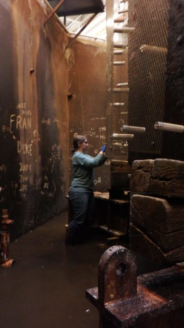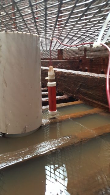 At the end of the season we fully drain the tank so that we can clean up all the muck at the bottom. At the end of each work day we shovel up the loose concretion from where we were working, but there is always a bit remaining. Additionally, concretion and corrosion products have spalled off the turret thanks to the ER system. ER helps to passivate the turret’s metal and encourage the concretion clinging to the surface to separate from the object. All of this is shoveled up and removed so that the chloride-rich debris doesn’t release chlorides back into solution. We don’t want to put salts back into the turret!