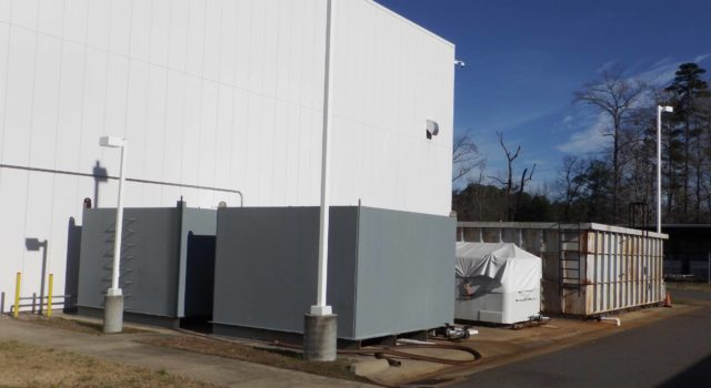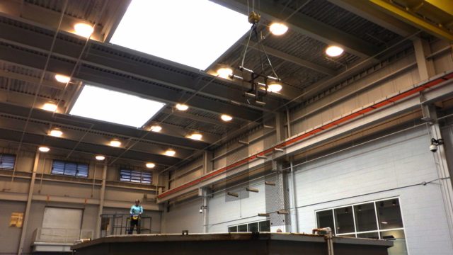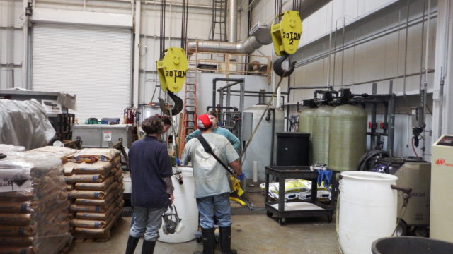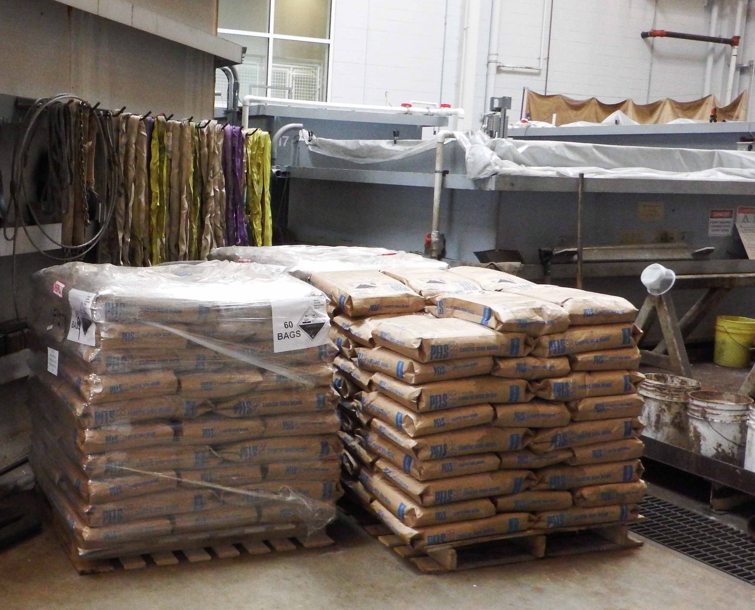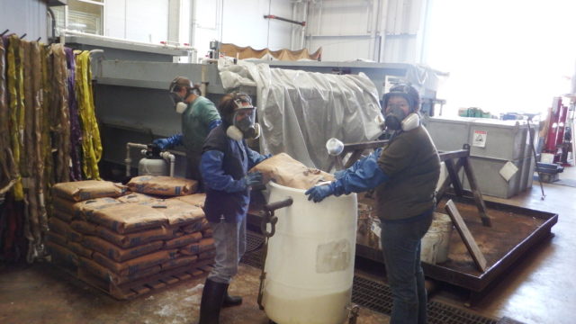 Now that everything is in place and the water’s ready to go, it’s time to fill. We wave goodbye to the turret and close the hatch door. As the tank slowly fills with water we being to add the sodium hydroxide. We must wear long gloves and full face mask respirators while filling because the hydroxide is very caustic. All told, 150 50 lb. bags are added to the solution using the overhead cranes. The entire fill process takes about 5 hours from starting the water to cleaning up.