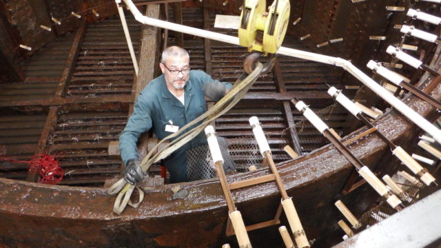We use steel mesh sheets to cover as much surface area of the turret as possible. These anodes are part of the ER system. They are linked together with wire and attached to a rectifier along with the turret. The anodes have a positive charge and the turret has a negative charge. This encourages the negative chloride ions to migrate out of the iron and into solution since they are attracted to the positively charged anode sheets. Since the anode sheets are large and heavy, we use the overhead crane to put them into position.