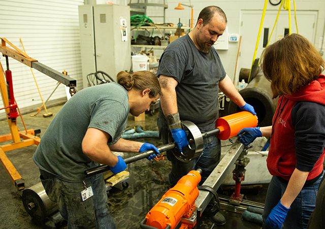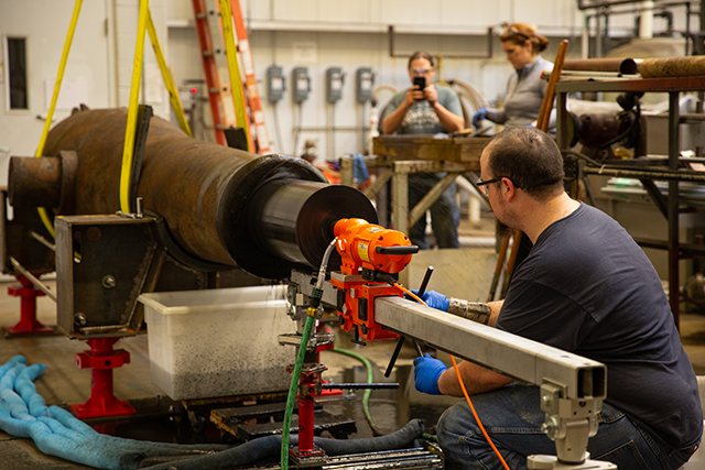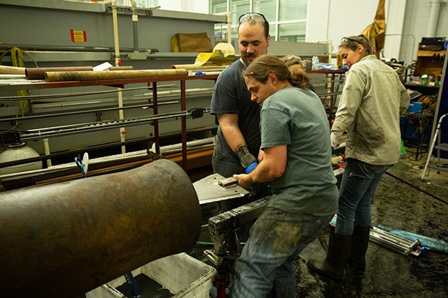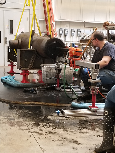 And that brings us to how do you go about boring a Dahlgren, especially one where the outer surface has turned into fragile graphite. After a lot of research and design work, we decided to use a custom horizontal coring drill system. This let us use a series of different drill bits to clear concretion out of the gun bores, all the way to the back of the gun!