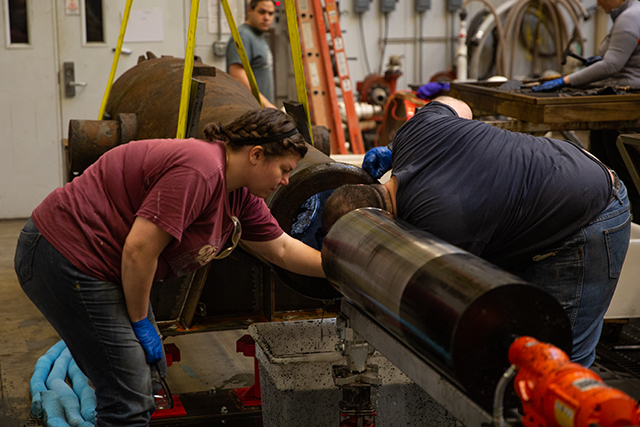 From there it’s a matter of correctly setting up the coring drill, slowly aligning it with the bore, and beginning to drill. We only go in a few inches at a time, before taking the drill back out to remove concretion and make sure the drill isn’t straying off path. The first drill bit we used was a custom-made coring bit. It’s basically a cylinder of pipe with abrasive cutting teeth at the front, made with a diameter of exactly 10.9 inches. The guns have an 11” bore diameter, so a tiny bit of concretion will remain (temporarily)… but using an 11” drill bit in an 11” hole would mean there is absolutely zero room for error, and that any additional abrasive action from loose concretion will start to wear into the gun’s surface. The goal is to get as close as possible, but to leave just enough room to avoid damaging the gun.