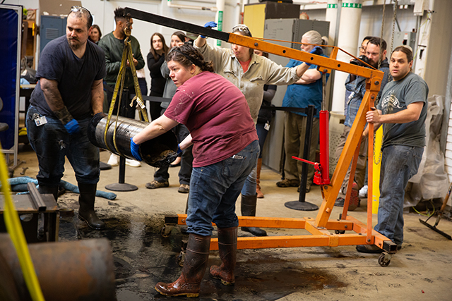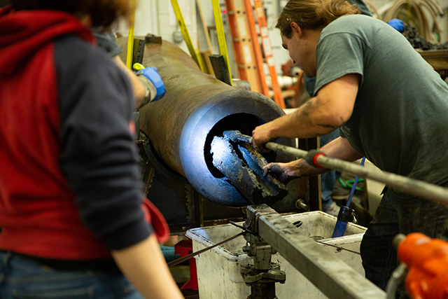 Once we were near the back of the gun, we needed to change things up a little bit. From the front of the barrel to a depth of 10 feet, the gun bores have a diameter of exactly 11 inches. But the last few inches of the bore form a curved gunpowder chamber, and a cylindrical coring bit can’t be used to clean it. Normally when cleaning a gun with a curved powder chamber, using a drill is impossible; you have to use (very) long chisels. However, if you’ve had the opportunity to research and measure an identical gun… well, that gives some other options!