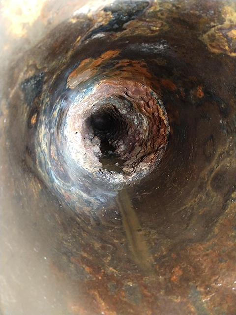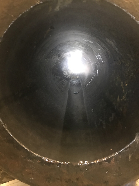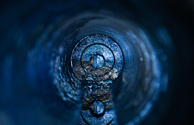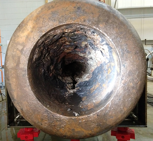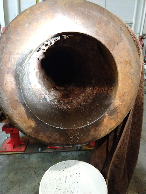 We were then able to use a giant spade bit, custom made to the exact shape of the powder chamber (but, like the coring bit, 0.1” smaller) to remove the remaining concretion. Once that was done, all bulk concretion had been removed from the bore – success!