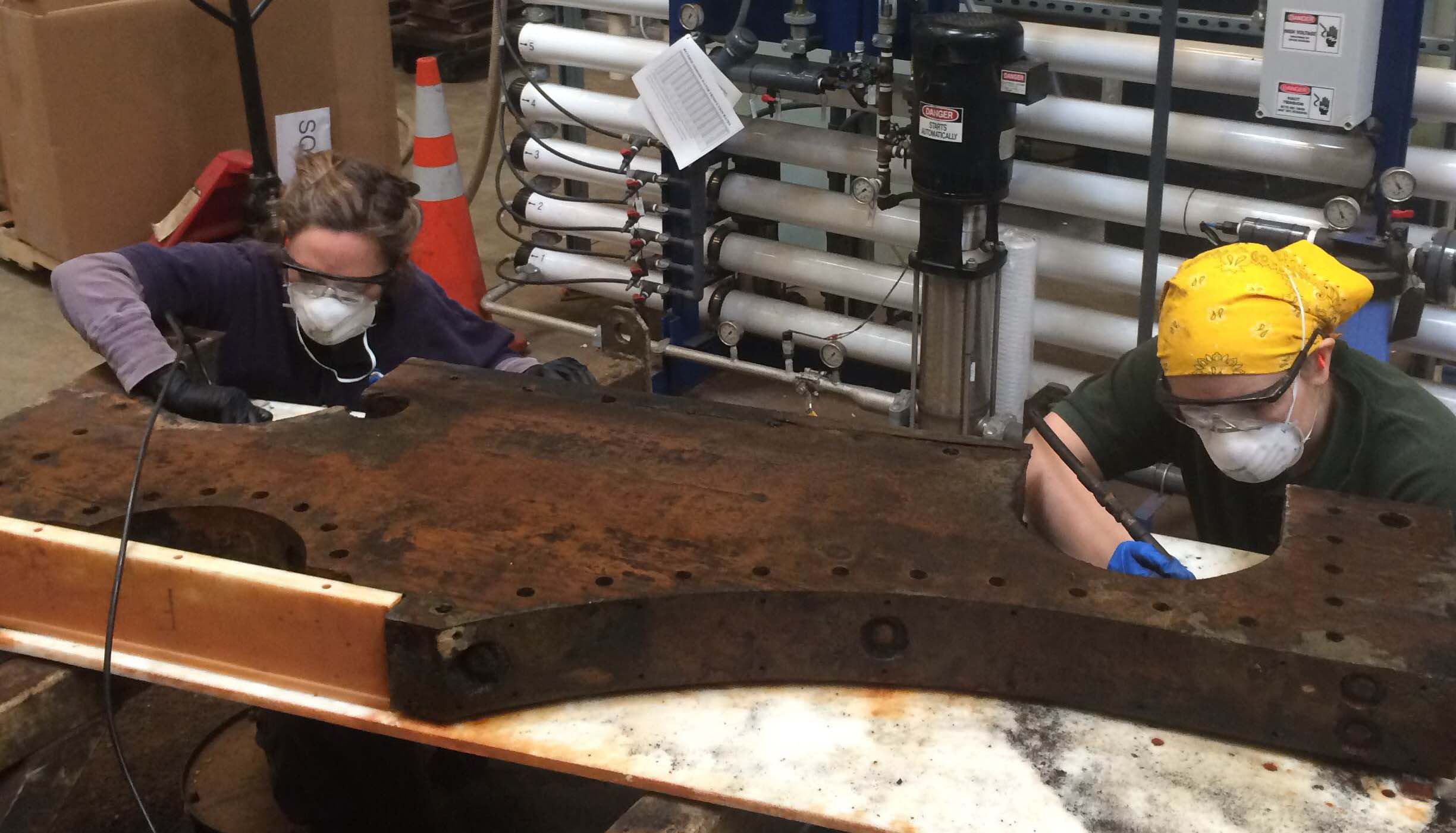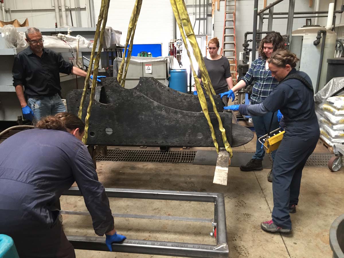 - However, full disassembly proved impossible due to 2 sets of white oak planking which are held together by large iron rivets that could not be taken apart. As a result, this made them wooden/iron composite objects of their own. Research and extensive testing had to be set to find an appropriate treatment to conserve these two materials together… which intrinsically require opposite types of care.