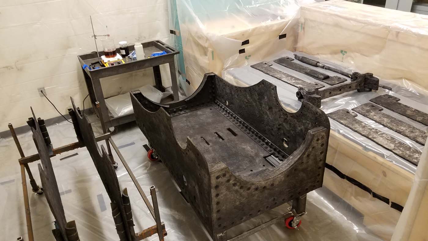 So after many years of cleaning, disassembling, successes and step backs, 2019 felt like time flew by as we dried the wooden/iron sides and the main iron components. The latter were also coated for added protection from environmental variations and they look phenomenal! We were recently in the process of prepping crates for storage of the many parts until an exhibit plan can be implemented and will get back to it as soon as possible.