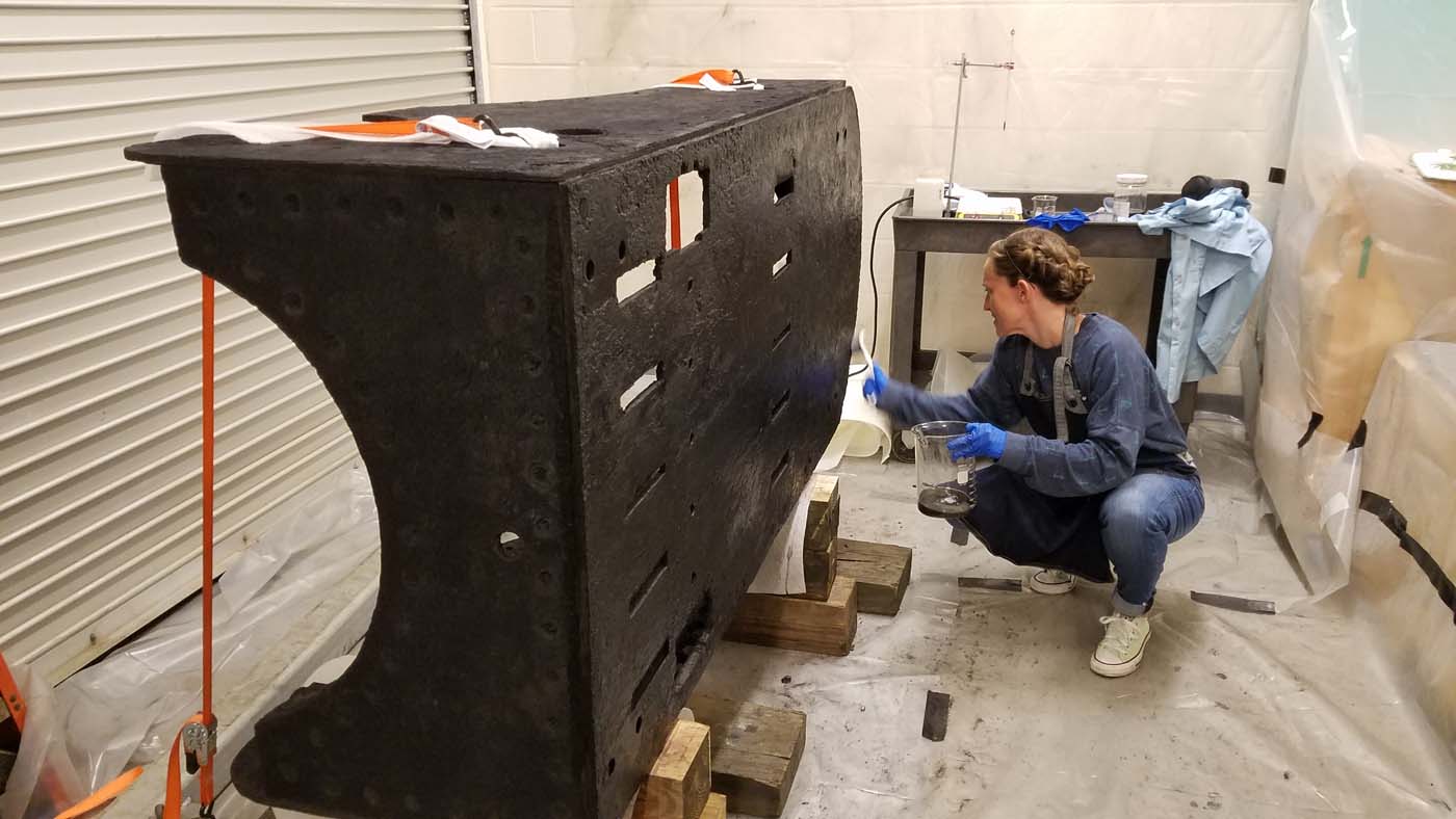 It has been too long since we’ve given an update on the conservation of Monitor’s port gun carriage. So long in fact, that the conservation of its 250-ish components are now complete!!!