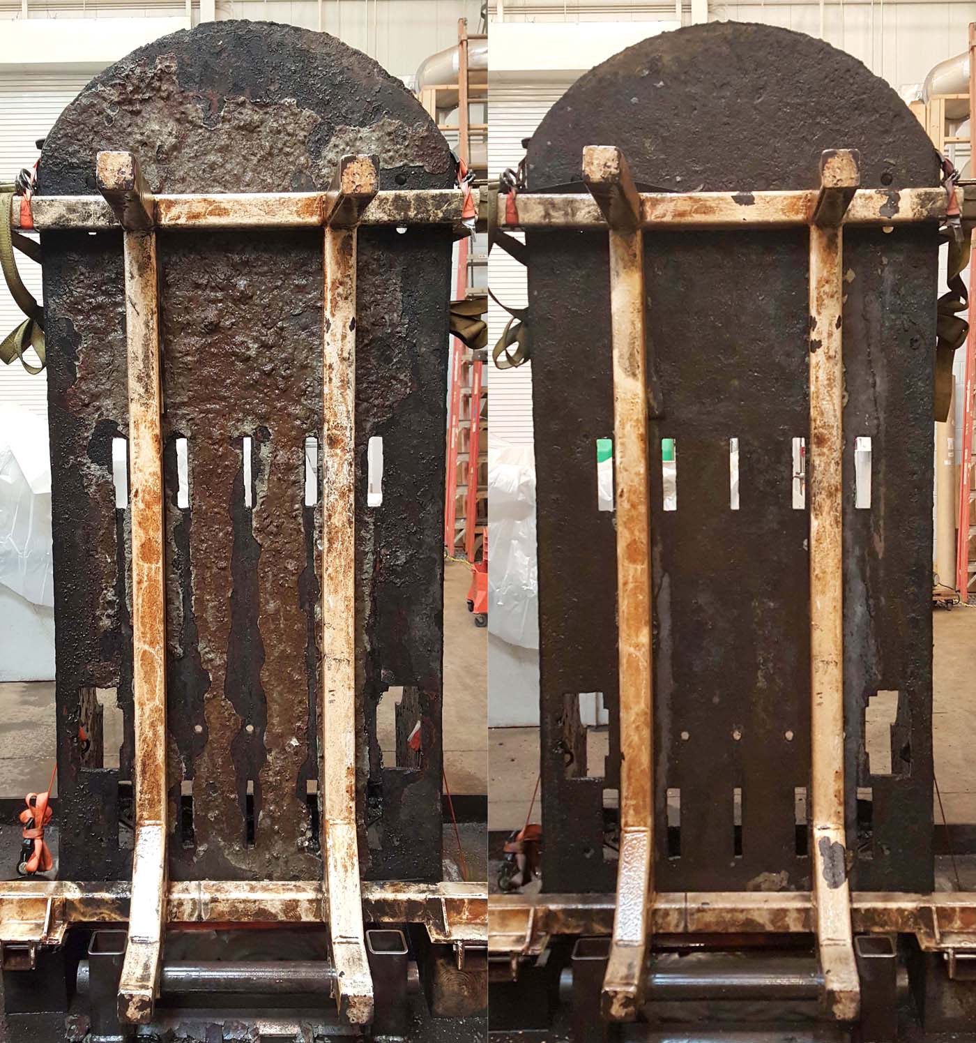 As a result, even after having already spent 5 years in a desalination bath, we decided to perform dry ice blasting on the main frame of the carriage and associated components, once a year, for the last 3 years of desalination treatment. Wrought iron has a unique way of corroding with pockets of impurities degrading first which make a perfect home for salts to accumulate. Cleaning the objects as thoroughly as possible is in their best interest!
