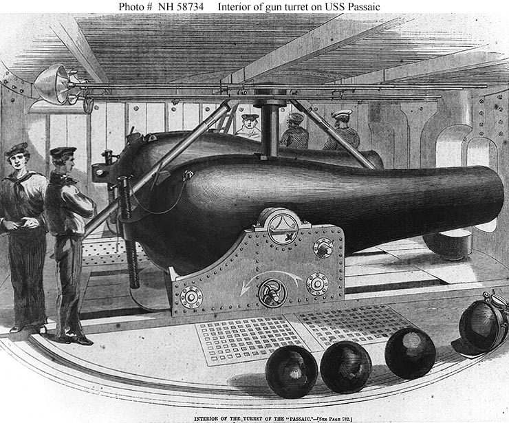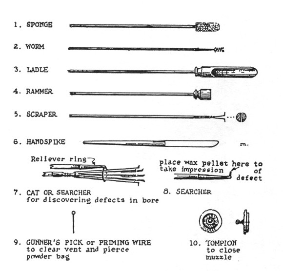 In the image above you’ll see illustrations of several historic cannon cleaning and loading tools. 1) The sponge would be dipped in water, and run down the barrel of the cannon to extinguish sparks in the bore after firing. 2) The worm cleaned unburned fragments of cloth powder bags from the bore. 3) Ladles were originally used to load powder, but after cartridge bags came into use, they were used to extract loads from the muzzle. 4) The rammer sealed cartridge and ball in place in the barrel. 5) The scraper and searchers were used to clean the gun. 6) The handspike helped to move the gun carriage and to adjust the gun’s elevation. (From Albert Manucy, Artillery Through the Ages (Government Printing Office, 1949). All of these tools would be used to maintain the Dahlgren guns on Monitor and generally used each time the cannon was fired.