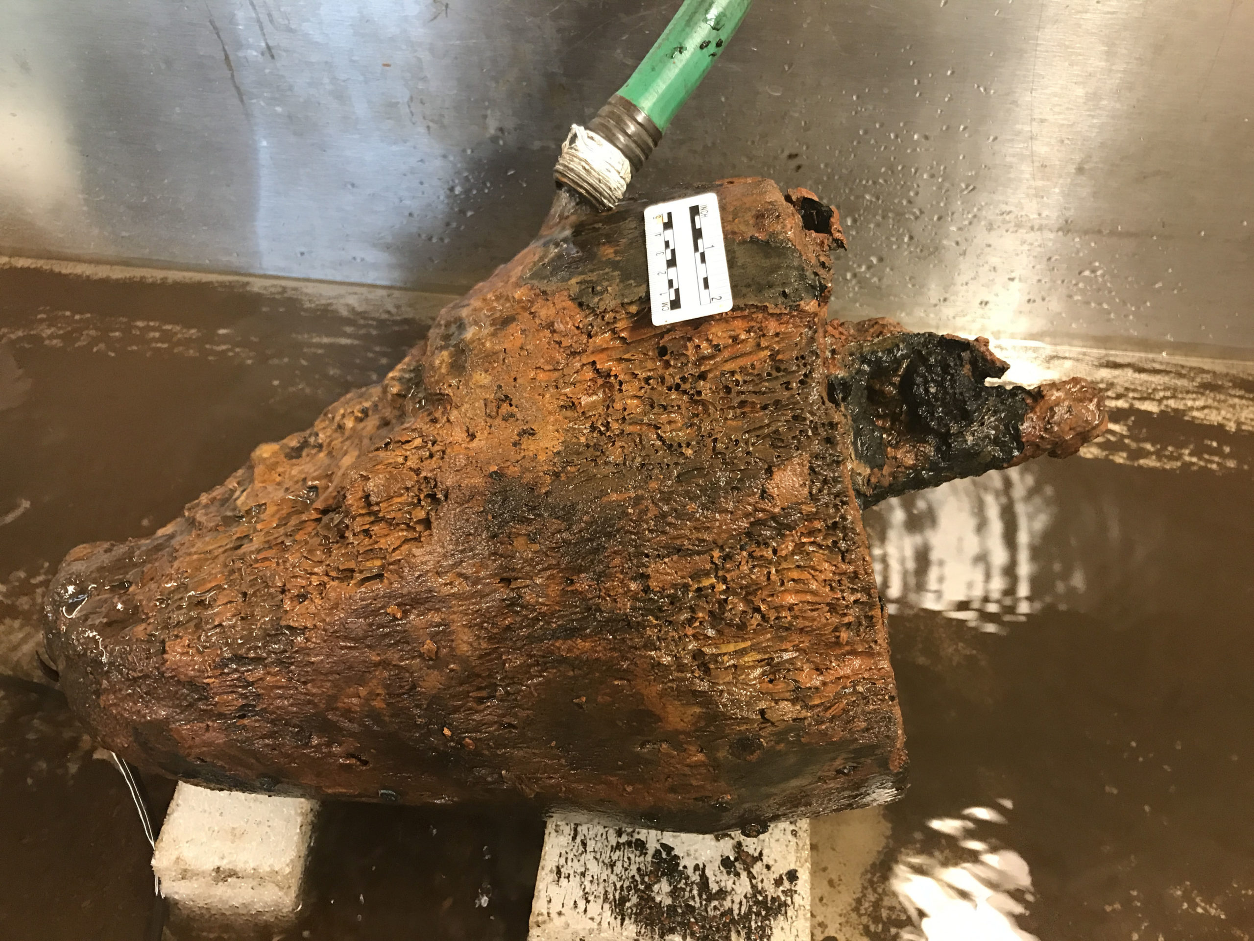 However, the first step was a clear choice–clean the mud and marine growth off the surface. For this process, I used a combination of pneumatic tools and an ultrasonic dental scaler. The dental scaler is the same tool the dentist uses to clean your teeth, and with adjustable water jets and sonic cleaning, it also makes a great tool for cleaning waterlogged organics.