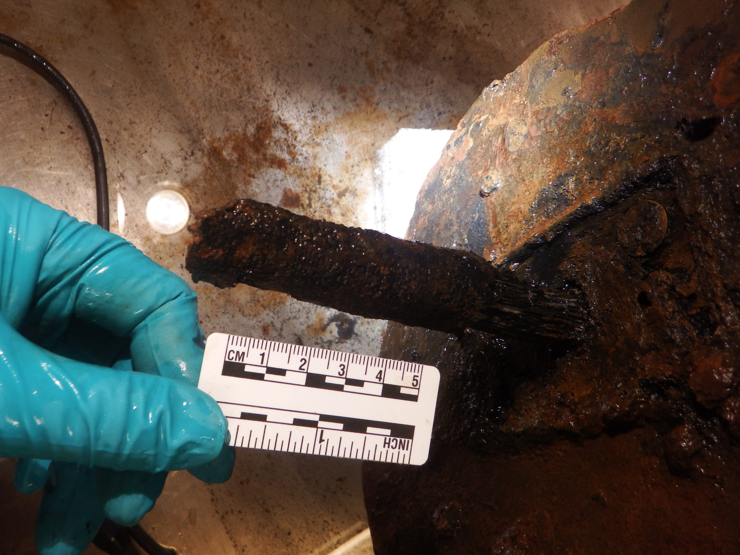 We have several examples of these gun tools in the Monitor collection, specifically, worm, sponge, and rammer. I have been working on one of the gun tools, a combination sponge and worm tool. This tool has a wood body, with an iron handle, and the majority of the handle was removed during excavation. It also has a copper alloy worm attached to the end. When it was in use, the wooden body would have been wrapped in fabric, so that it would retain moisture when dunked in water before cleaning the cannon barrel. The gun tool is also coming to the end of treatment, so I thought I would share with you all the process it has been through.