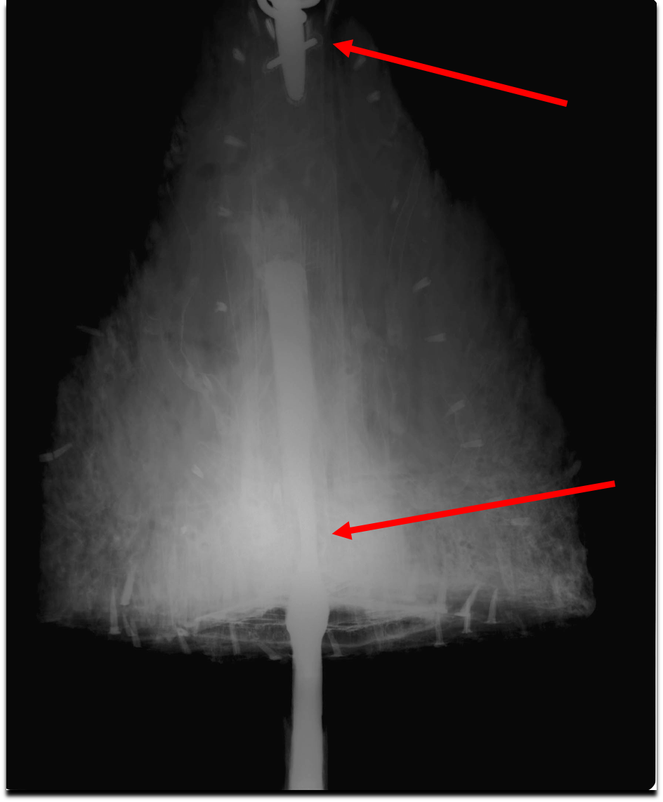 When I first started conservation on the gun tool, it was covered in compressed mud and marine growth from when it was buried on the ocean floor. This meant it was impossible to see if any of the fabric that would have been wrapped around the wood remained. Even though we could tell it was a gun sponge with a worm attached, it was difficult to tell what kind of condition the wood and metal pieces were in. We x-rayed the gun sponge, which allowed me to see how degraded the wood was, and how far the metal components extend into the wood body.