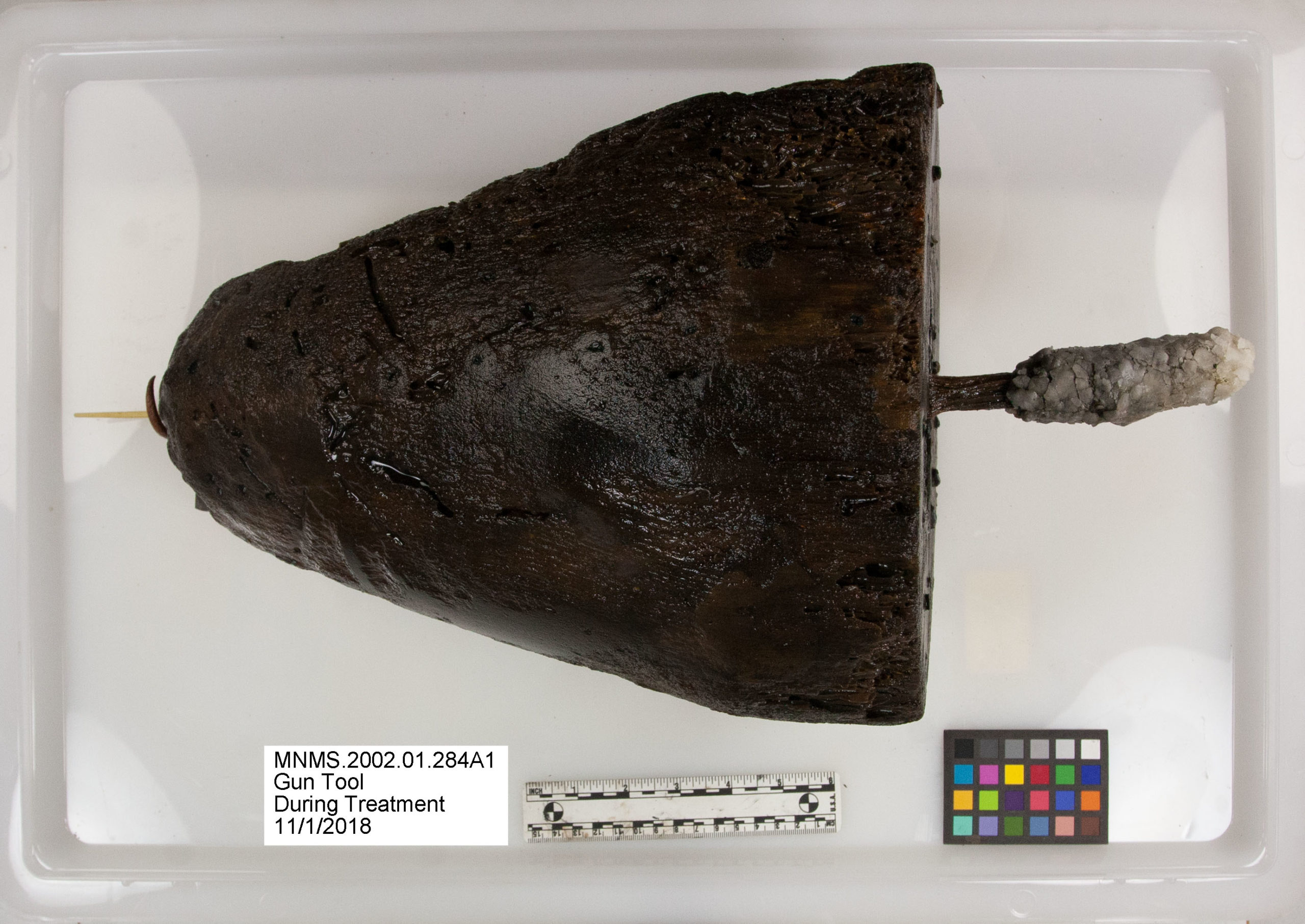 In Part I, I discussed the purpose of the gun tool. I also showed how the way the gun tool was constructed made it impossible for me to disassemble the tool and treat the metal and wooden parts separately. This meant I was going to have to think outside the normal conservation treatment box and treat the wood and metal parts together. I also mentioned that I found textile wrapped around the iron handle and that I’d have to take extra steps to ensure it was preserved through treatment.