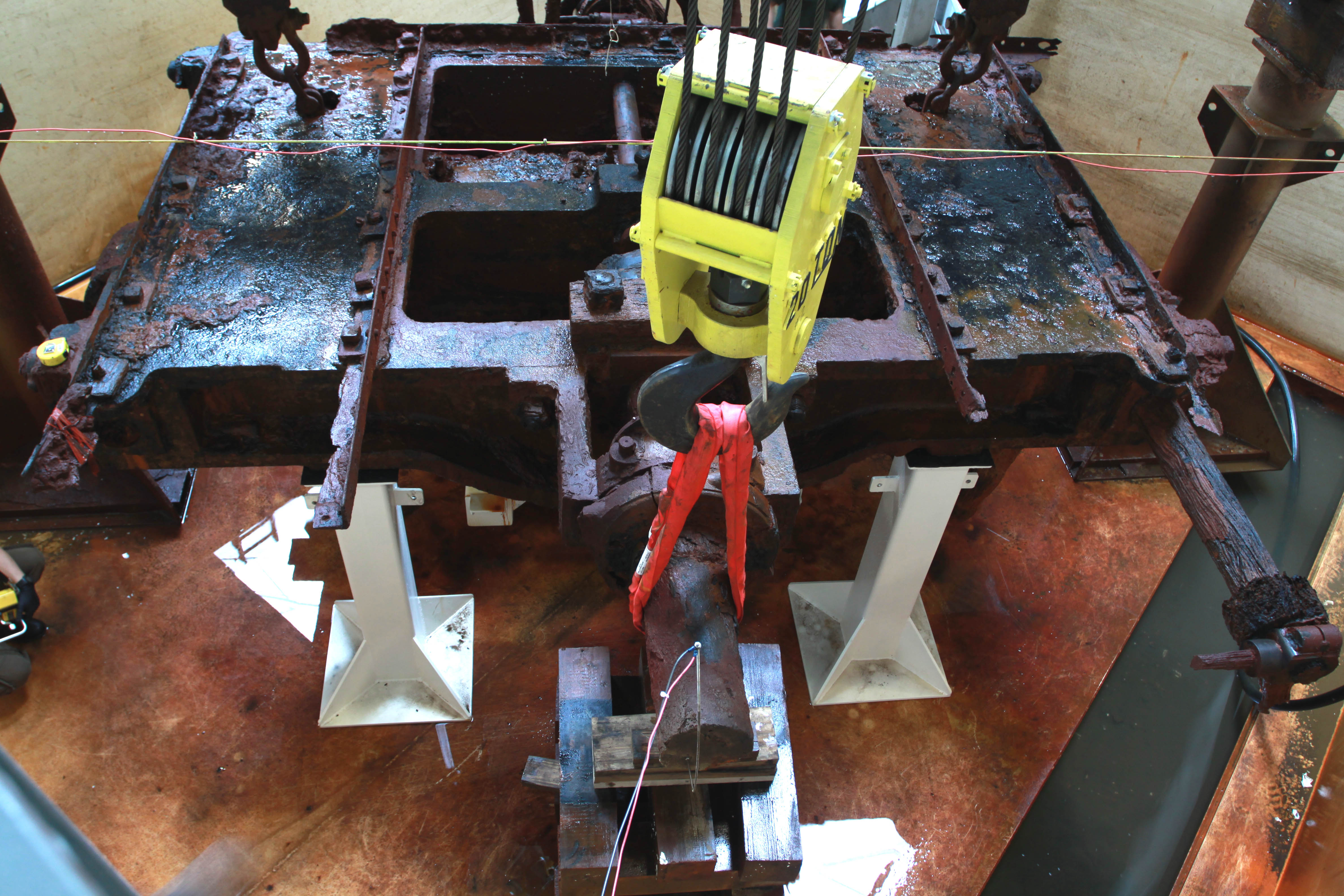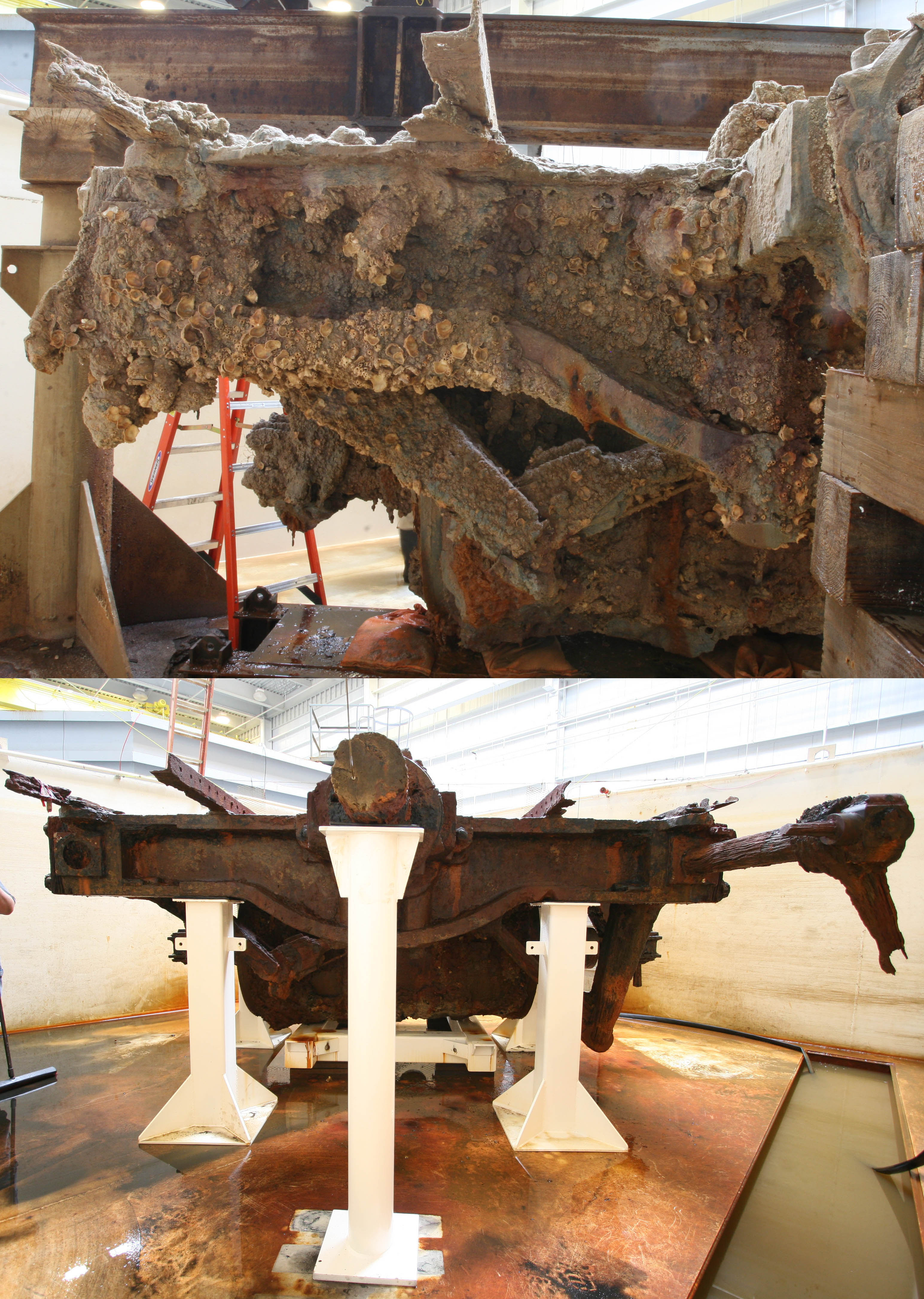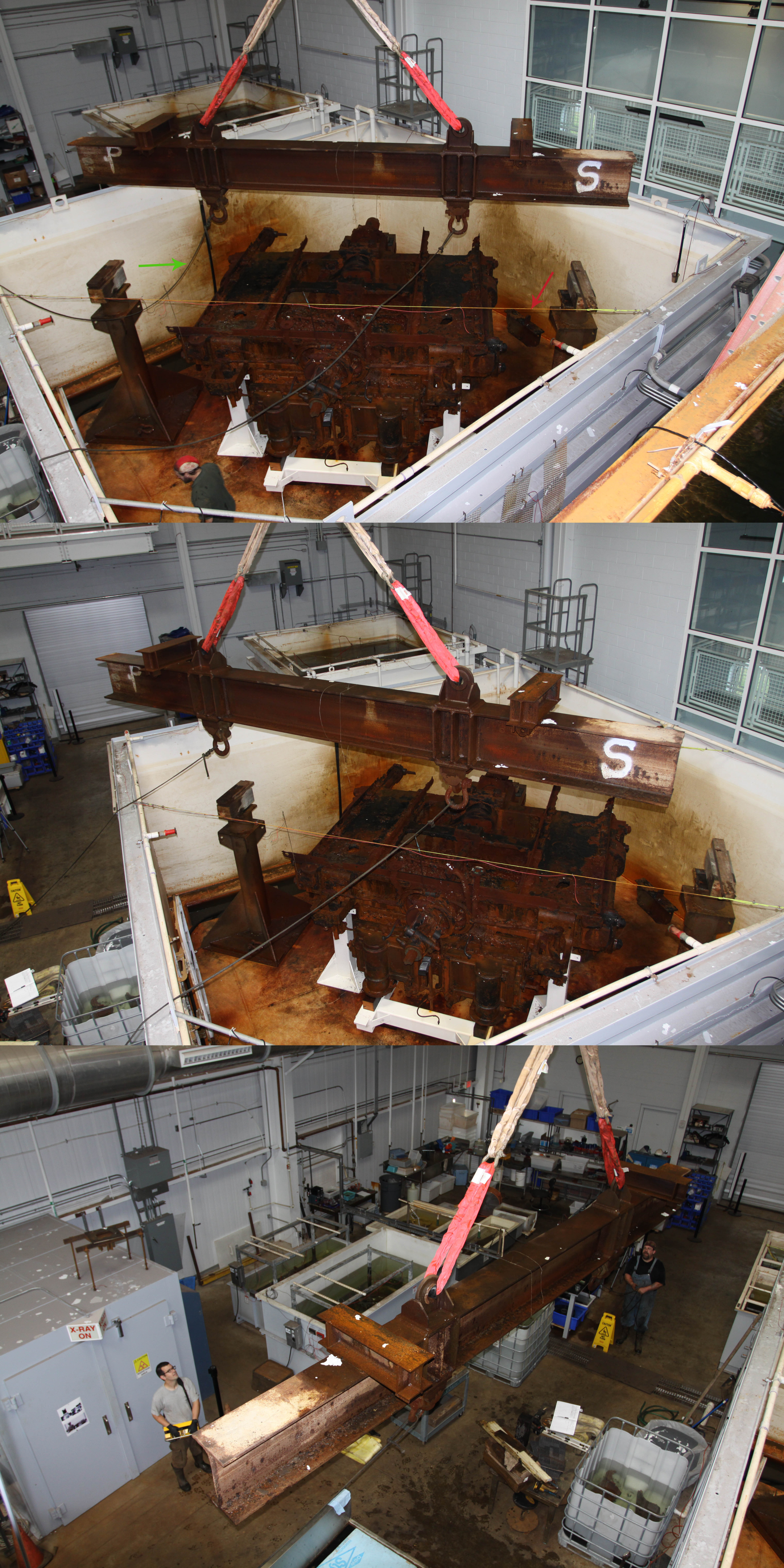 This past week the 30,000 gallon tank containing Monitor’s steam engine was drained for a key milestone in the conservation of this unique artifact. The purpose for the tank drain was the installation of a new support system under the engine that will enable the eventual disassembly of the object. Up to this week, the engine which weighs approximately 25 tons, had been suspended off the ground from a massive I-bean supported on large steel posts. In the images below, you can see the engine before and after recent deconcretion efforts suspended from the I-beam.