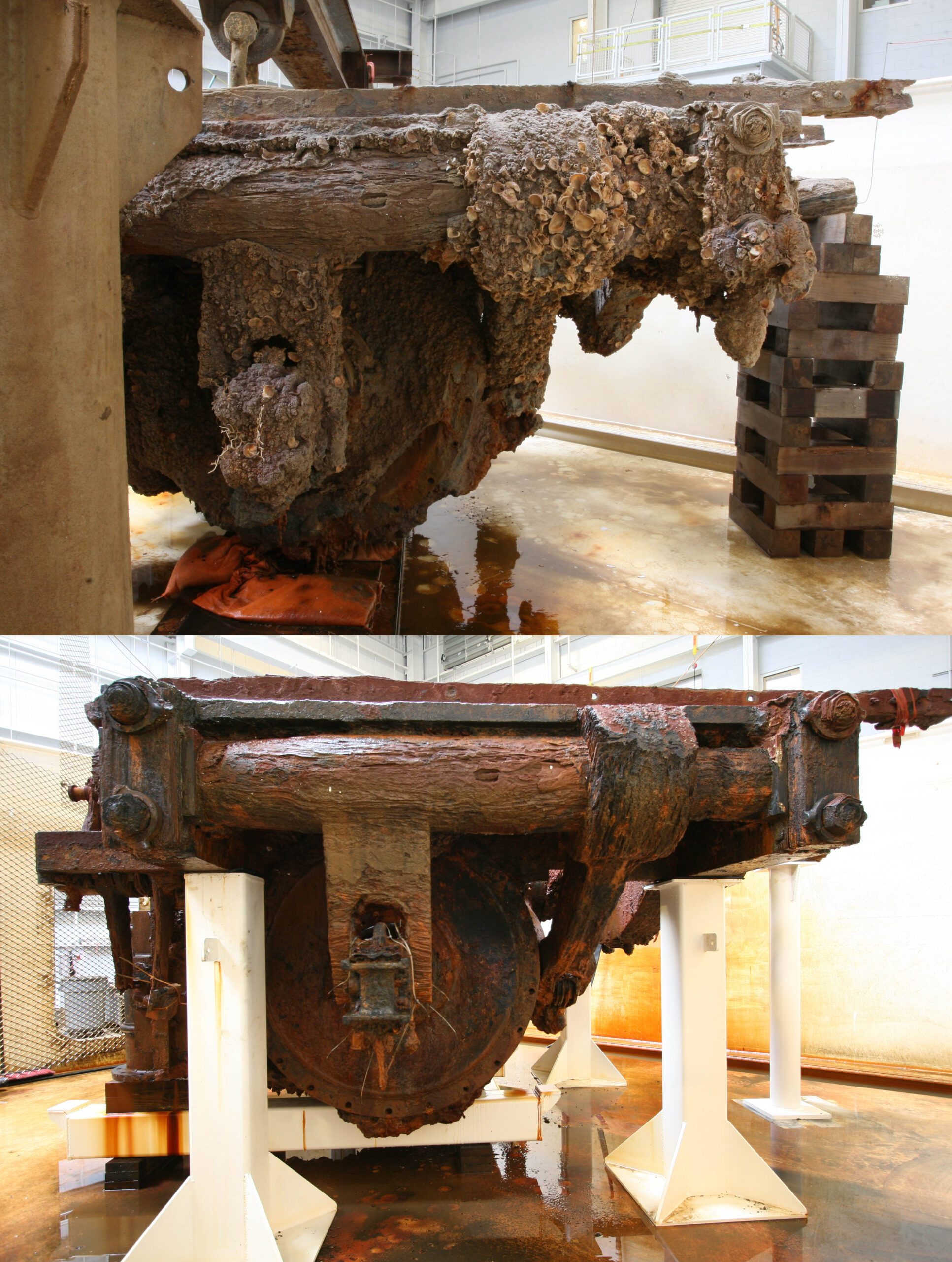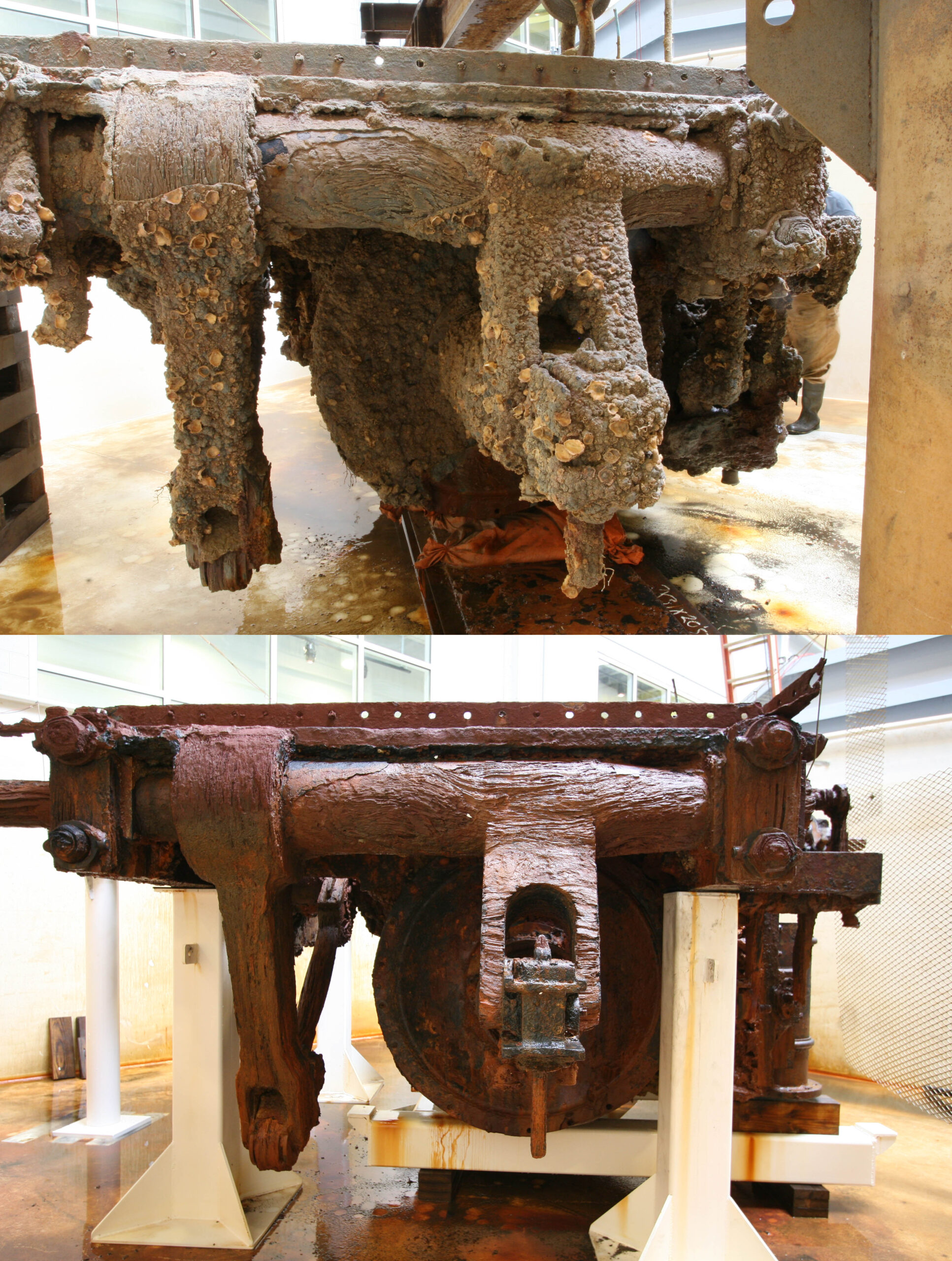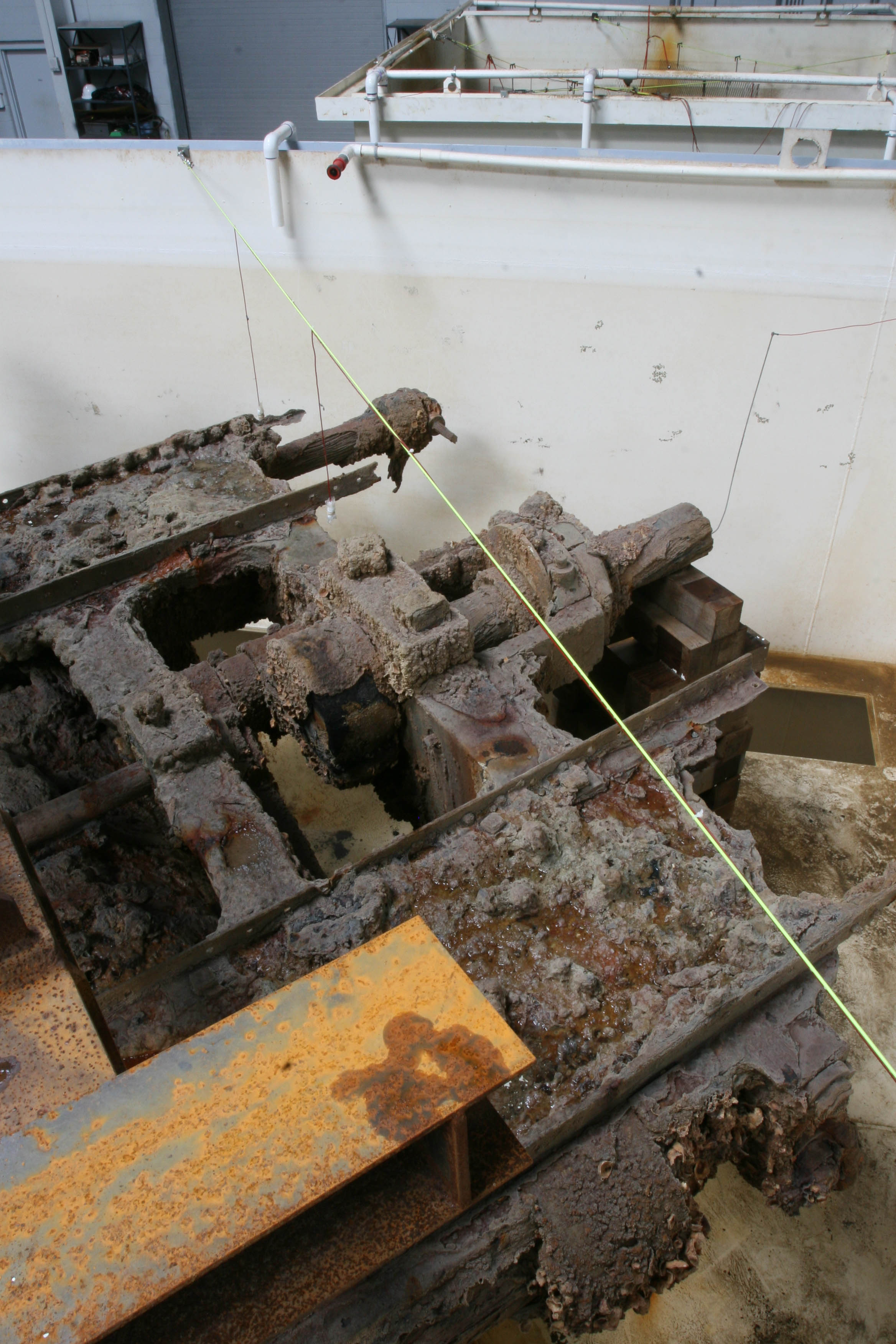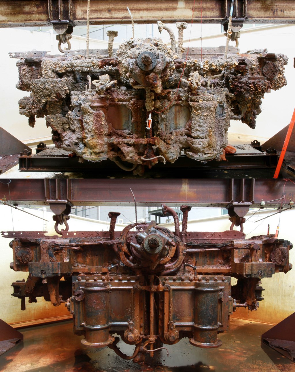 This past week the 30,000 gallon tank containing Monitor’s steam engine was drained for a key milestone in the conservation of this unique artifact. The purpose for the tank drain was the installation of a new support system under the engine that will enable the eventual disassembly of the object. Up to this week, the engine which weighs approximately 25 tons, had been suspended off the ground from a massive I-bean supported on large steel posts. In the images below, you can see the engine before and after recent deconcretion efforts suspended from the I-beam.