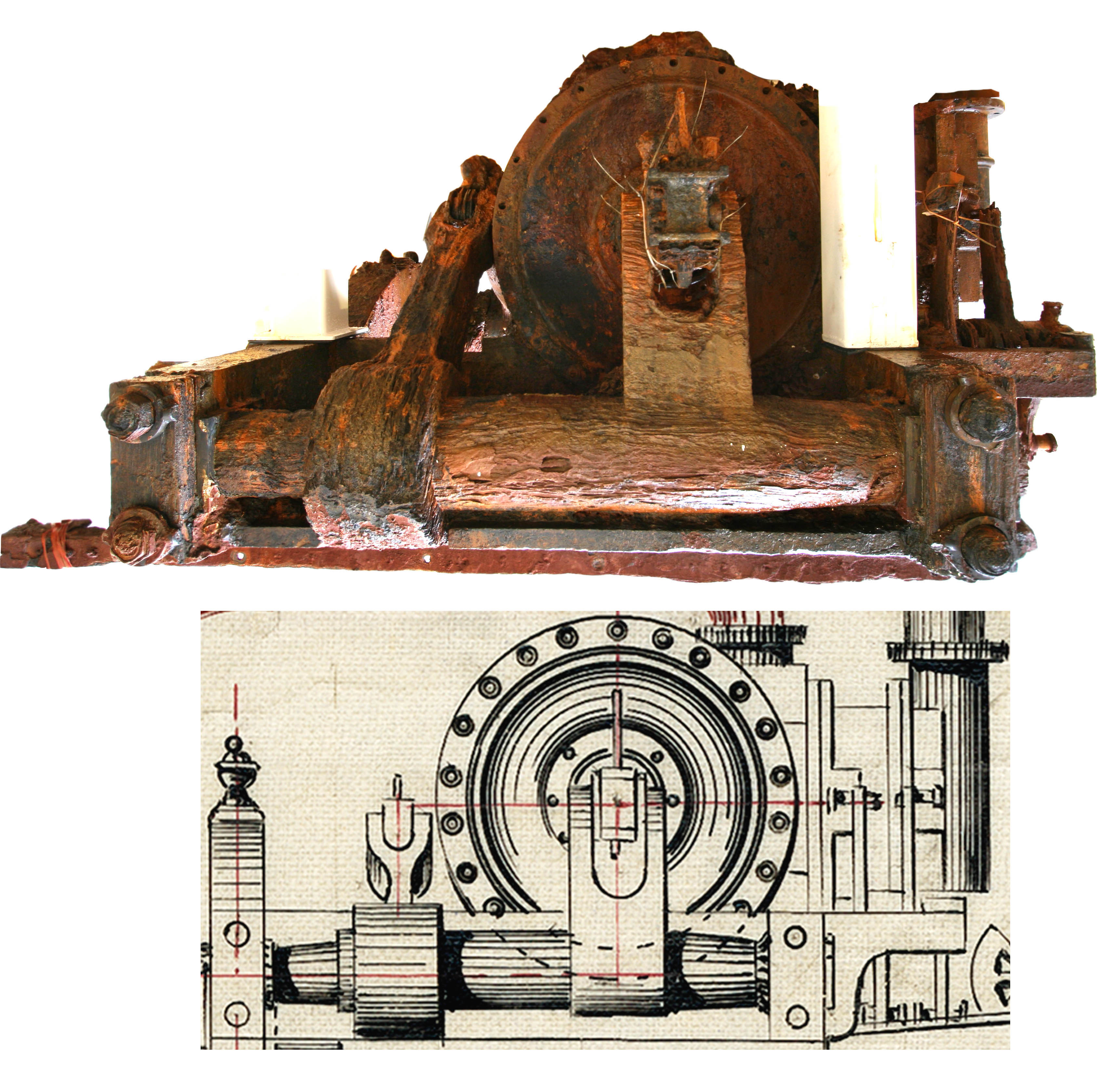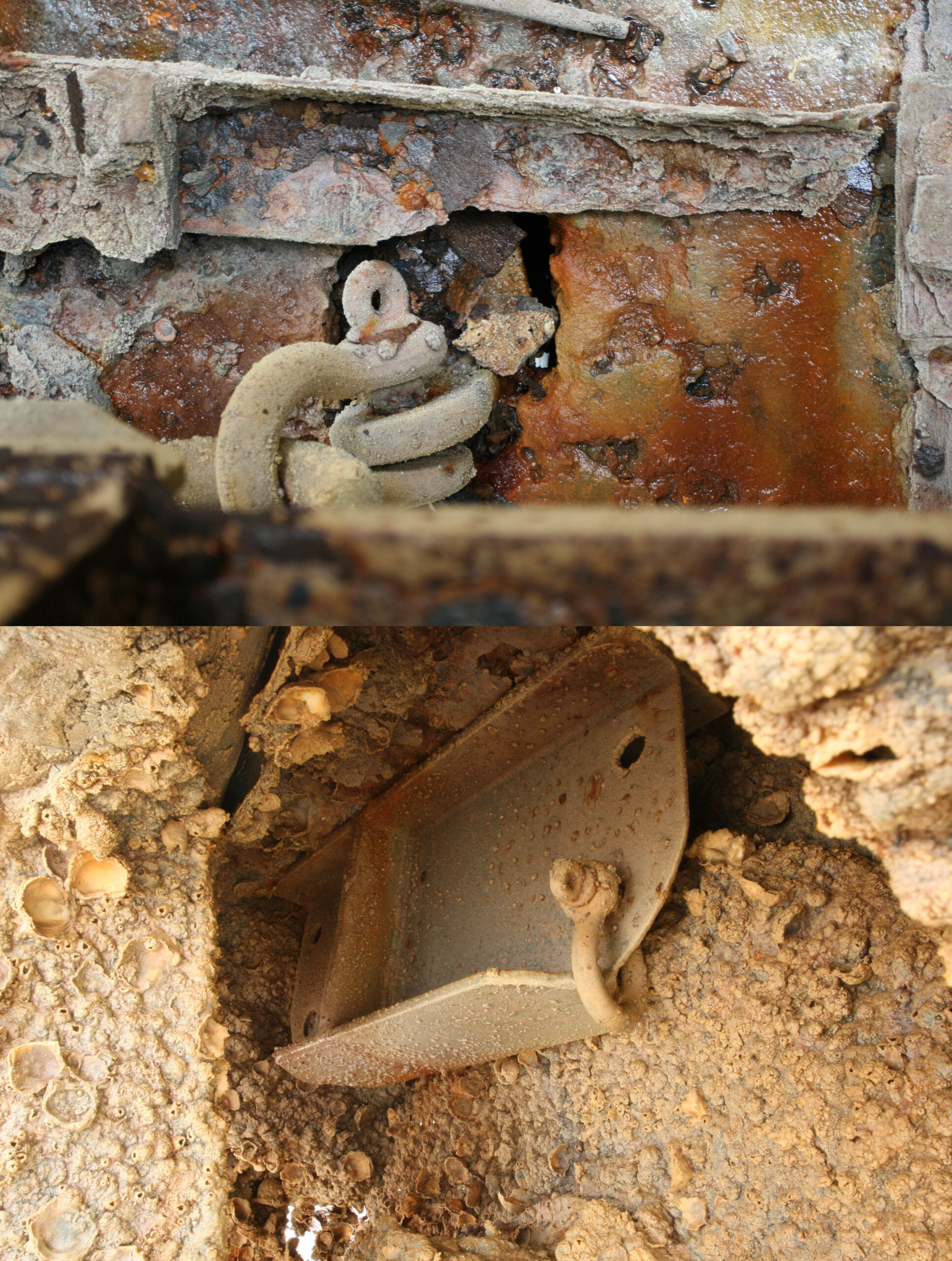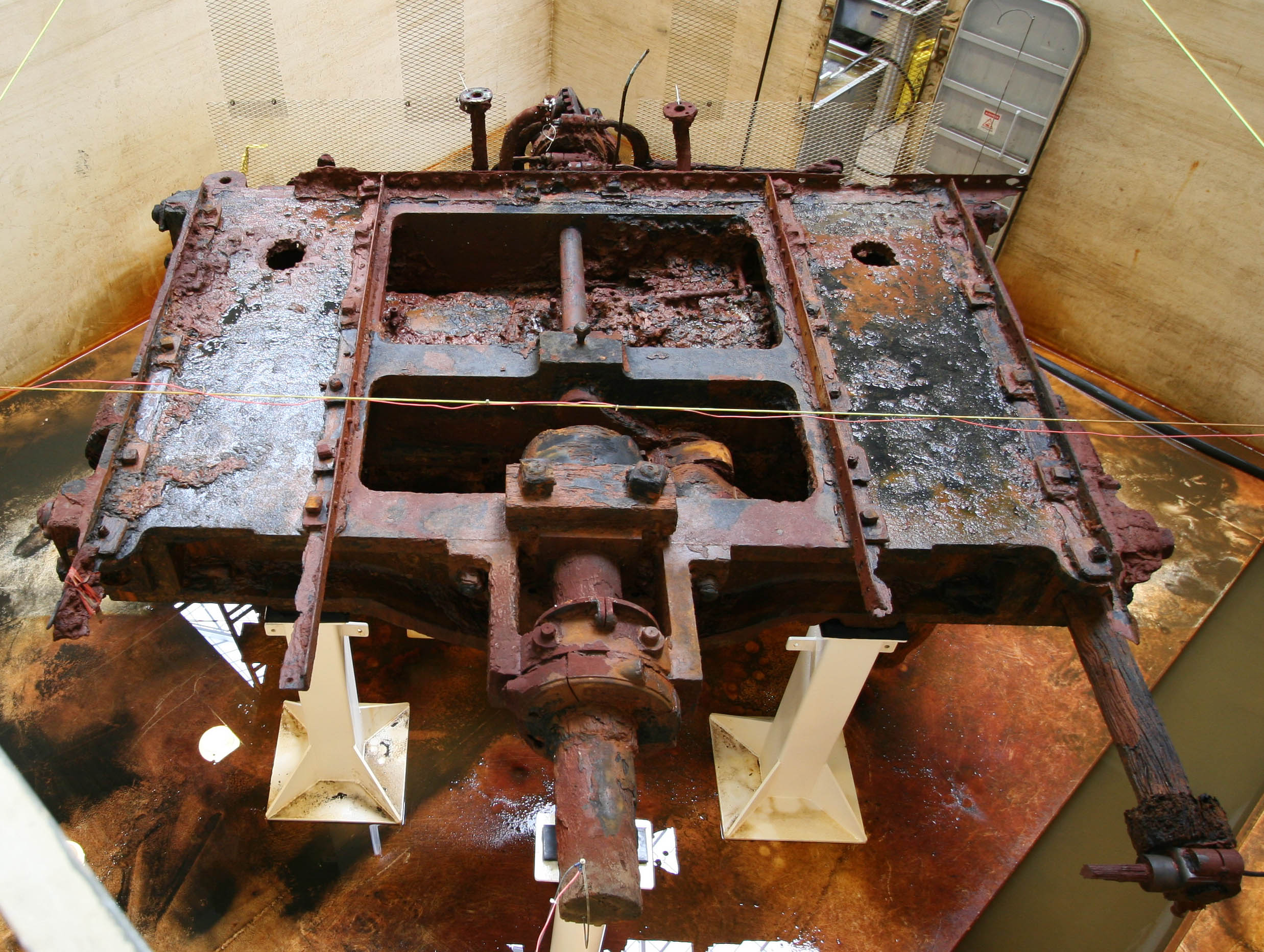 To connect the engine to the beam, steel frames with shackles passed though the engine bed up to the beam. In the images below, you can see one shackle and corresponding support frame as well as the hole cut through the engine bed to enable the mounting system to function. The hole was cut into the engine bed by Navy divers 230 feet underwater at the wreck site, which at that time was the best method for removal from the seafloor.