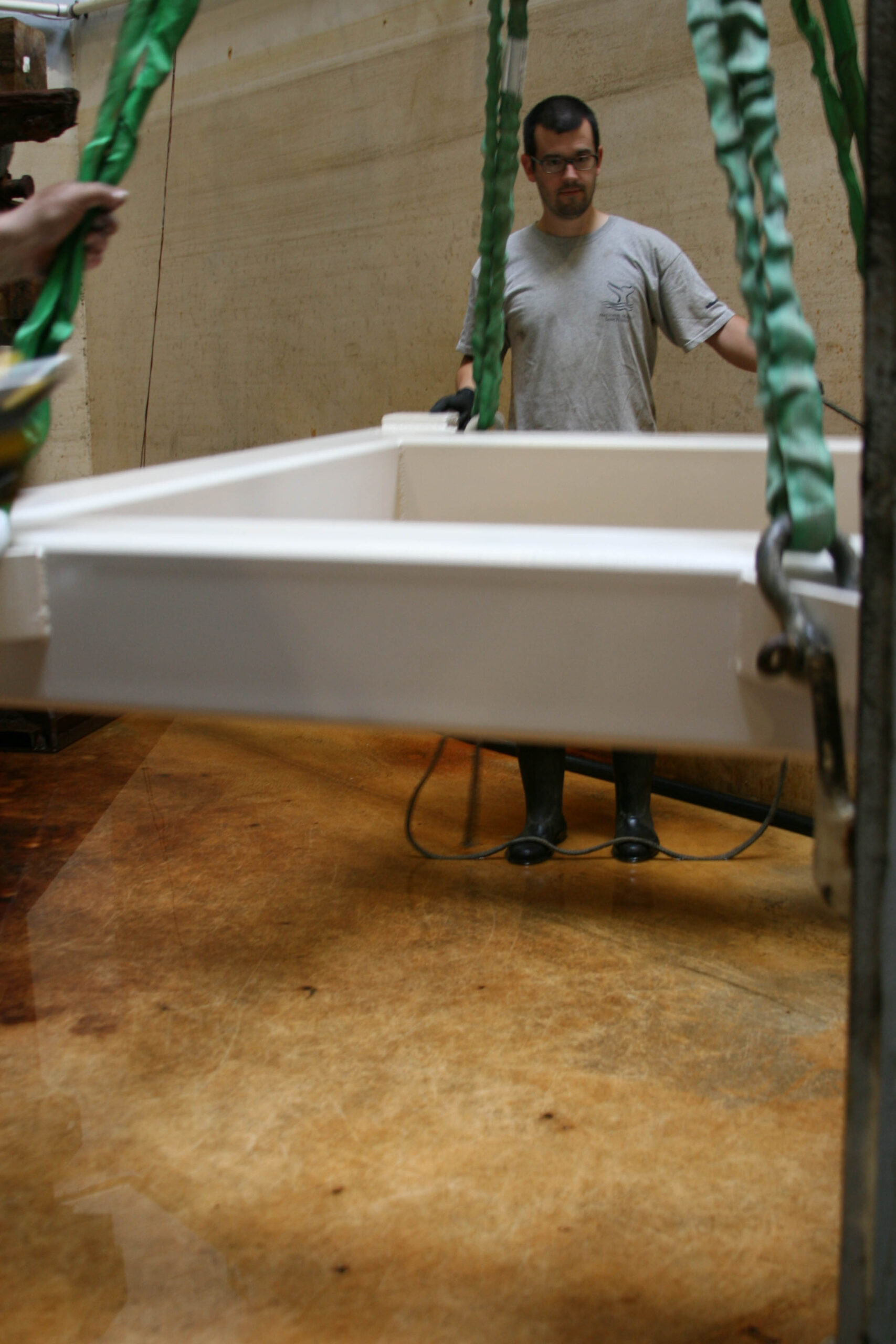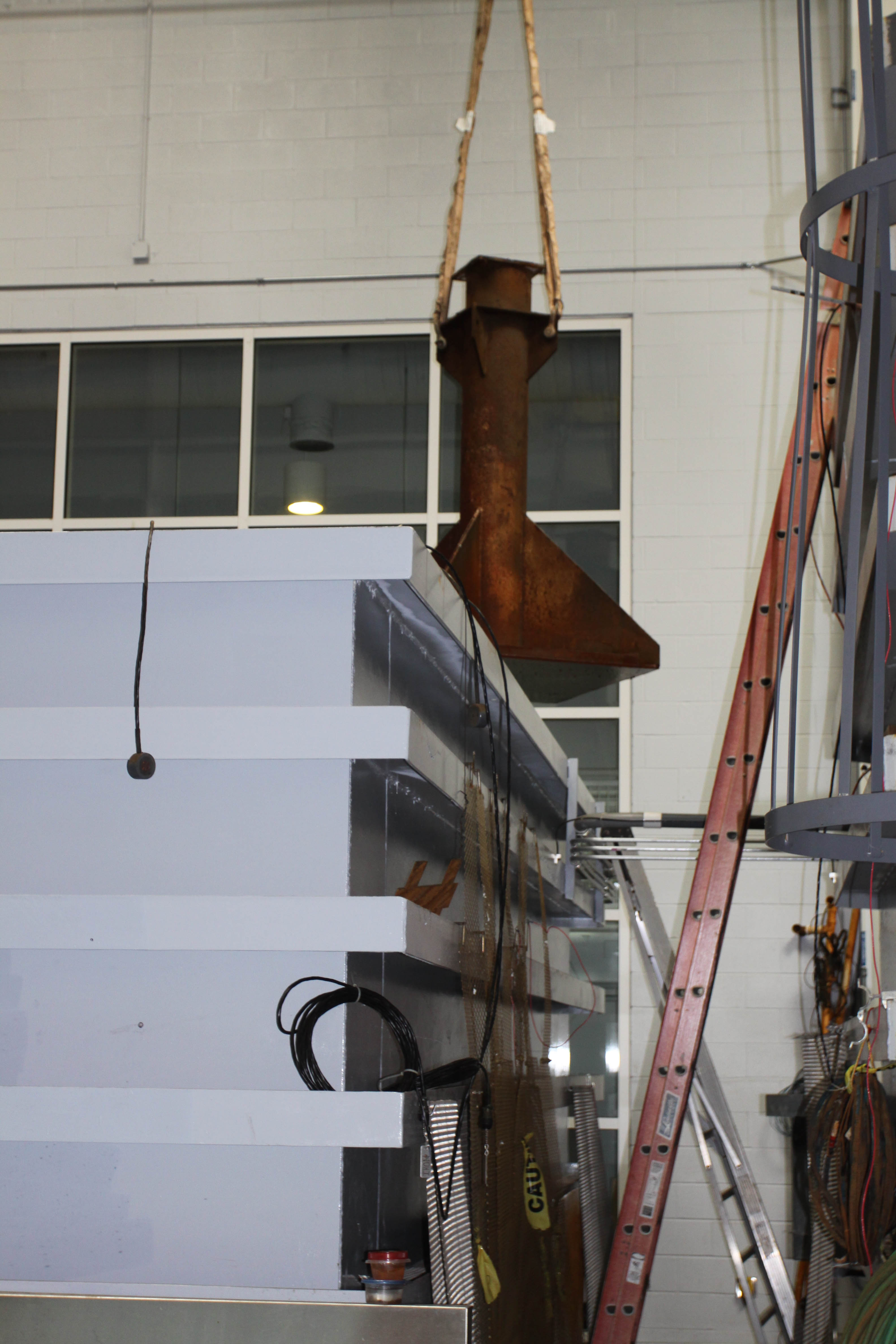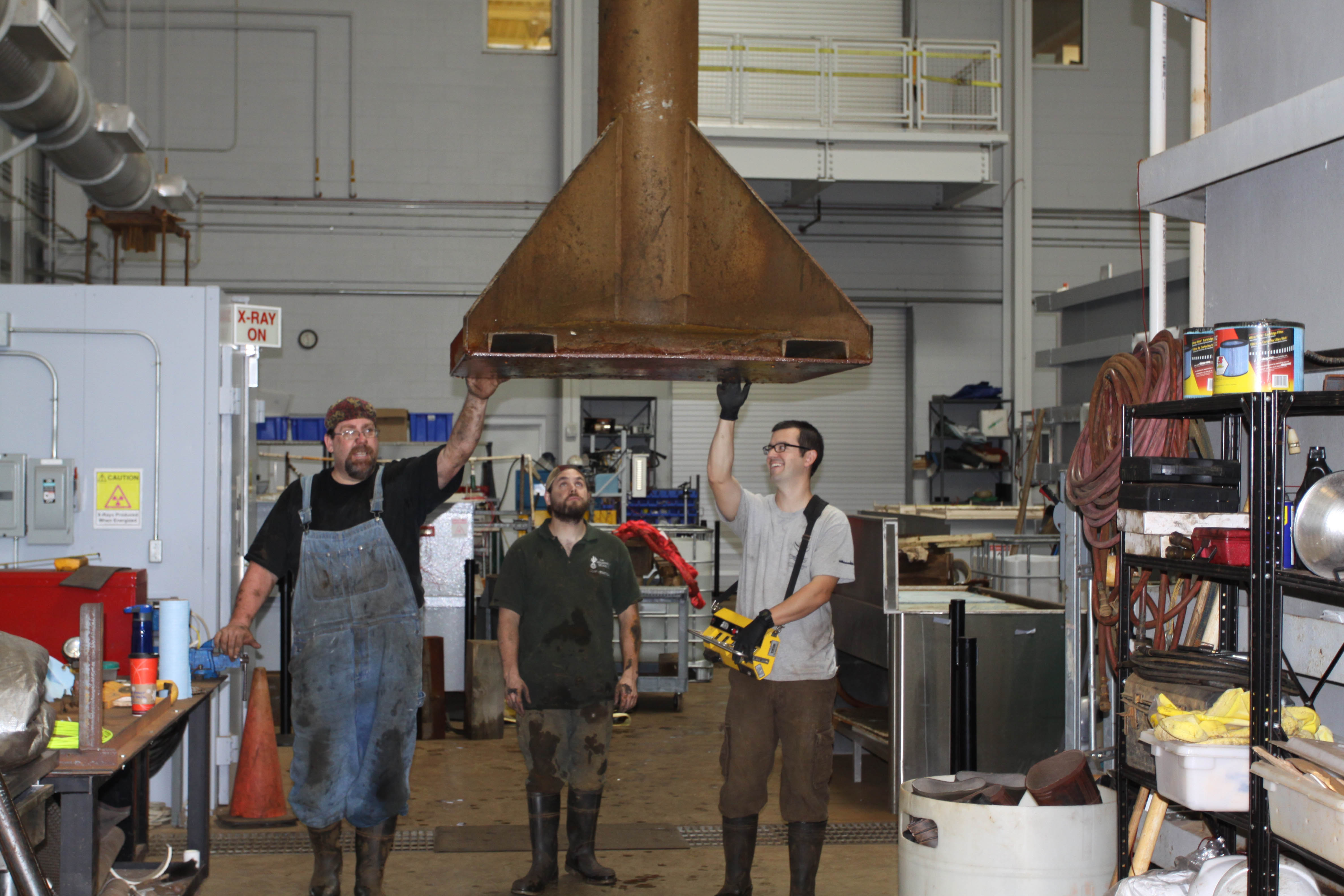 After the I-beam was removed from the tank and lab, we then removed the original beam support posts. You can see one of the posts being taken out of the tank below as well as a fantastic photo of Gary, Will, and Dave.