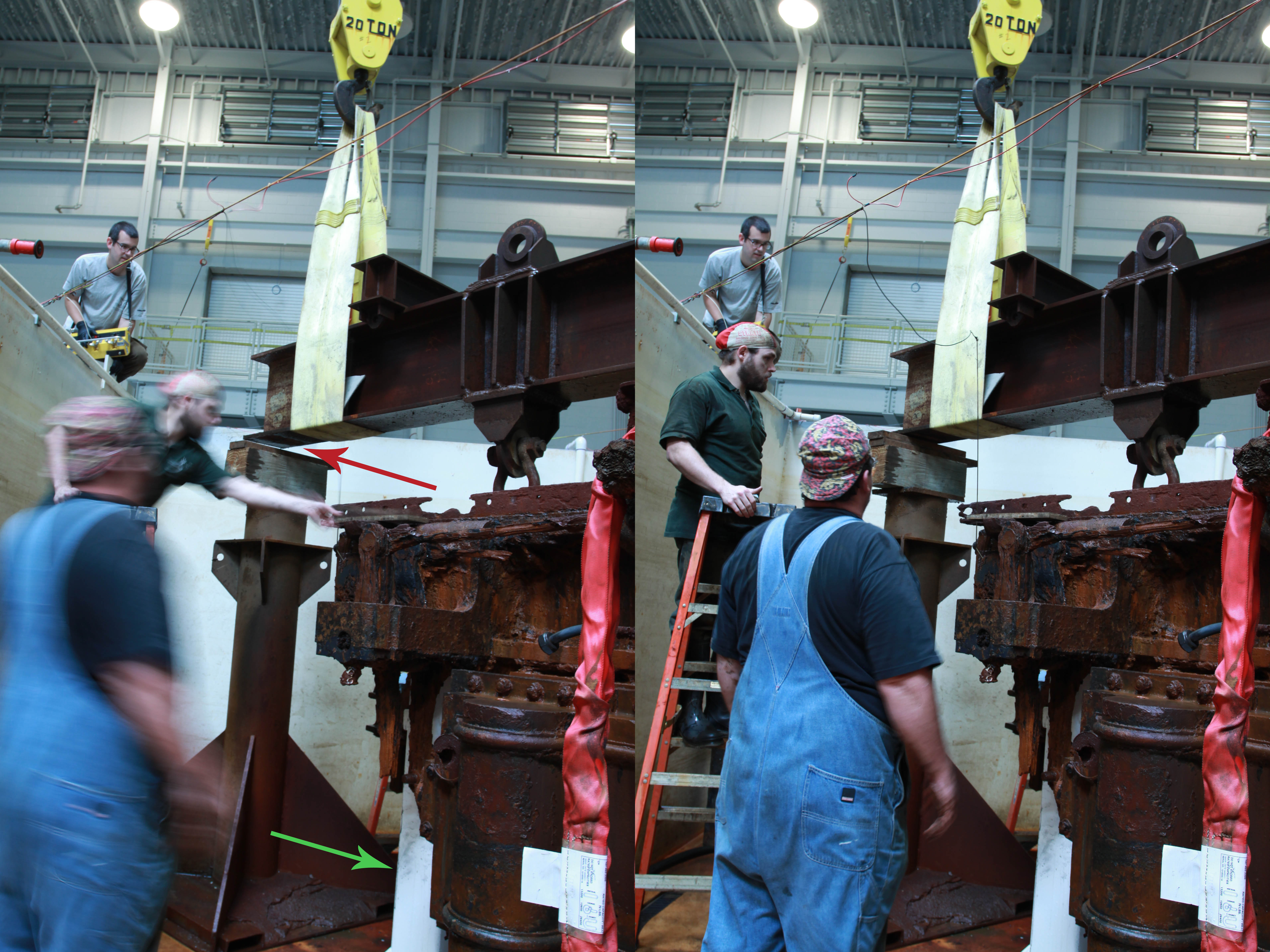 With the rear of the engine on its mounts, now it came time to place the new supports at the front of the artifact. To do this, each end of the massive I-beam was carefully lifted (one side at a time) slightly elevating one of the front corners of the engine to allow the new mounting posts to be placed. In the pictures below you can see Will, Dave, and Gary placing the new front post on the port side of the engine. The red arrow in the picture points to the distance the beam was lifted, while the green arrow points the new support post.