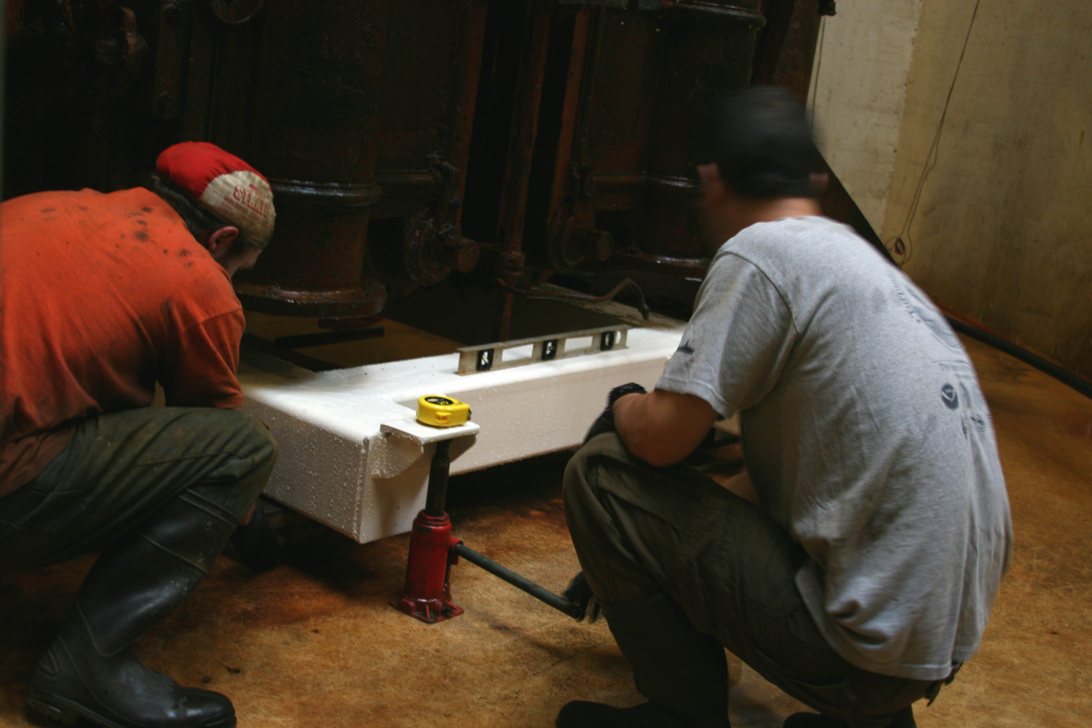 As treatment on the engine progressed over the last year, it became clear that before any large-scale disassembly of the object could commence, a more structurally-sound support had to be installed. The reasons for this were safety concerns for both staff and object, and to create a strong level mount from which components could more easily be removed from the engine. So, over the past several months Gary designed and fabricated new support posts to be placed under the propeller shaft, four corners of the engine bed, steam cylinder, and valve chests. In the following pictures you can see the cylinder/valve chest) support frame being put into place. (Dave in first, Will and Dave in second)