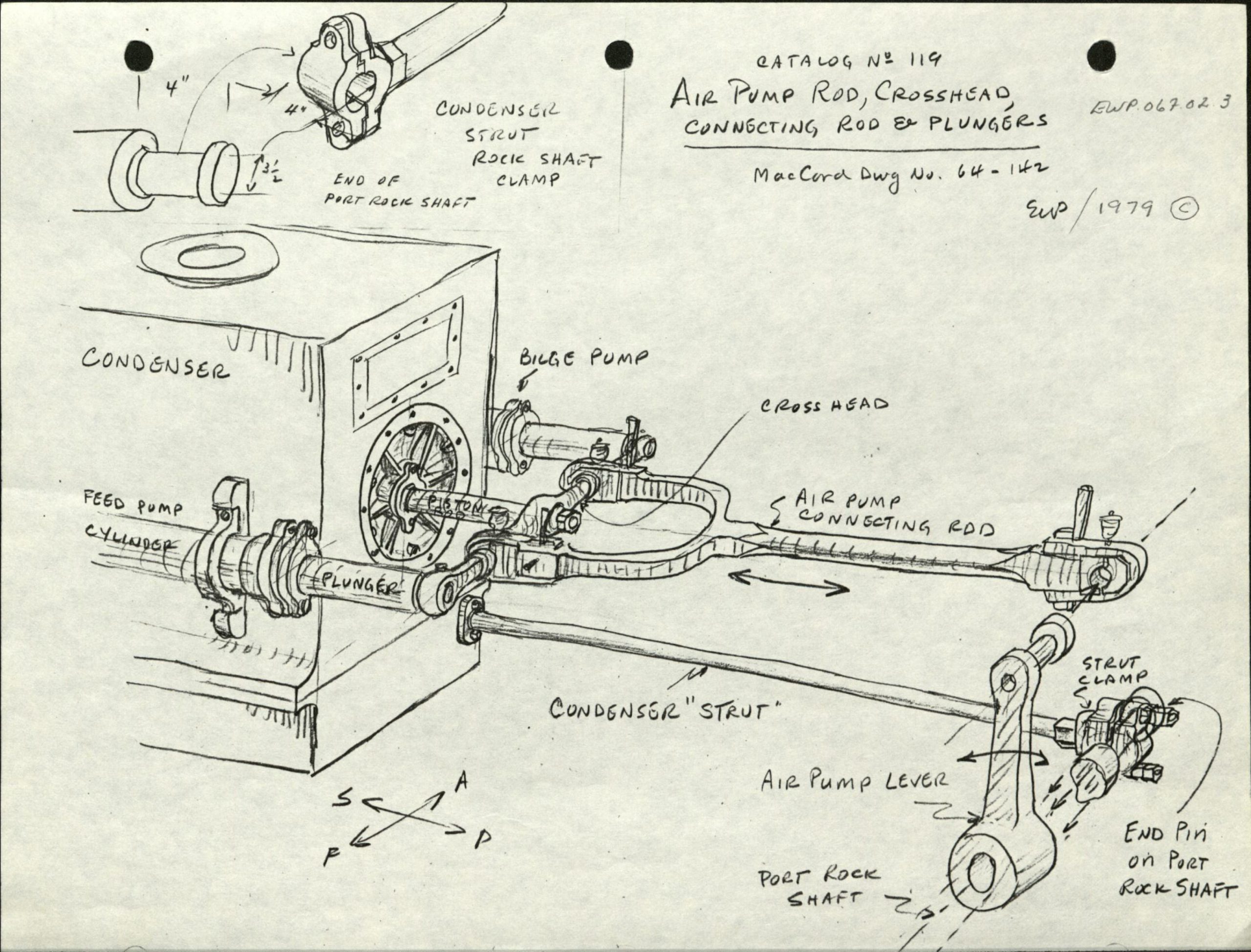 On Fig. 1 notice that there is a bilge pump attached to the opposite side of the casing from the feed pump. This is actually the ship’s main bilge pump and it has nothing to do with the condenser’s function! It is just sitting there for convenience. This disposition was apparently common at the time as it was out of the way and allowed to connect and power all three pumps (air, feed and bilge) to a crosshead driven by one of the engine’s rock shafts (Fig. 3). Pretty sleek!