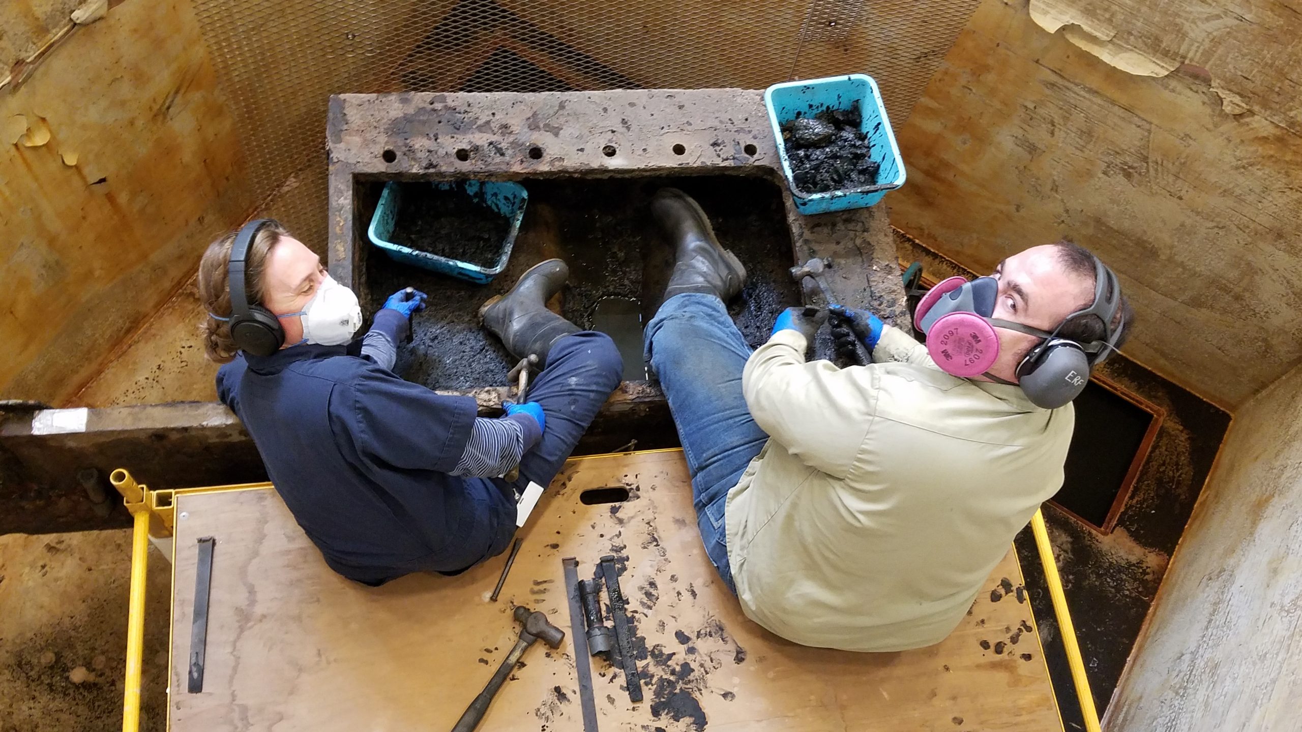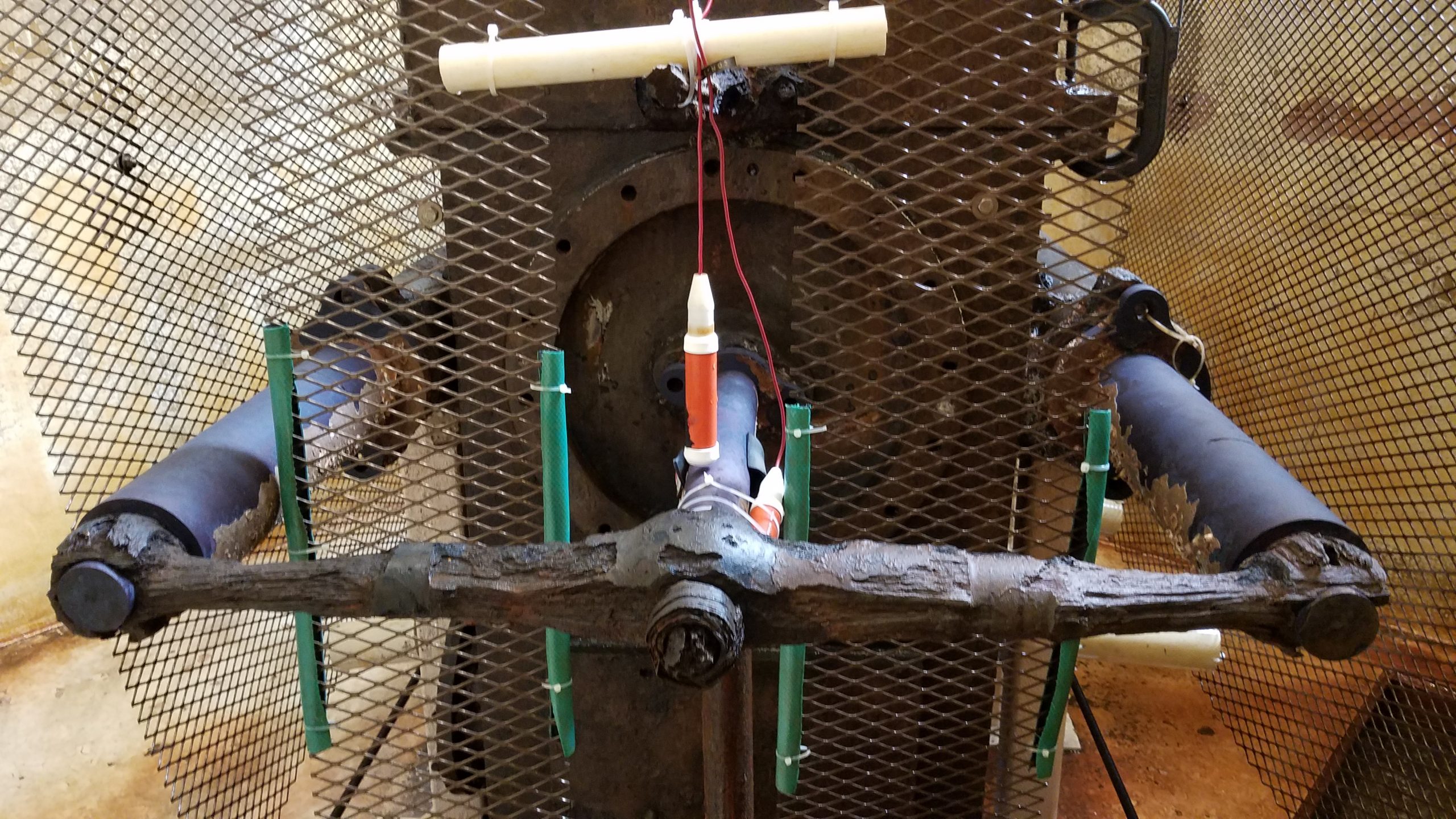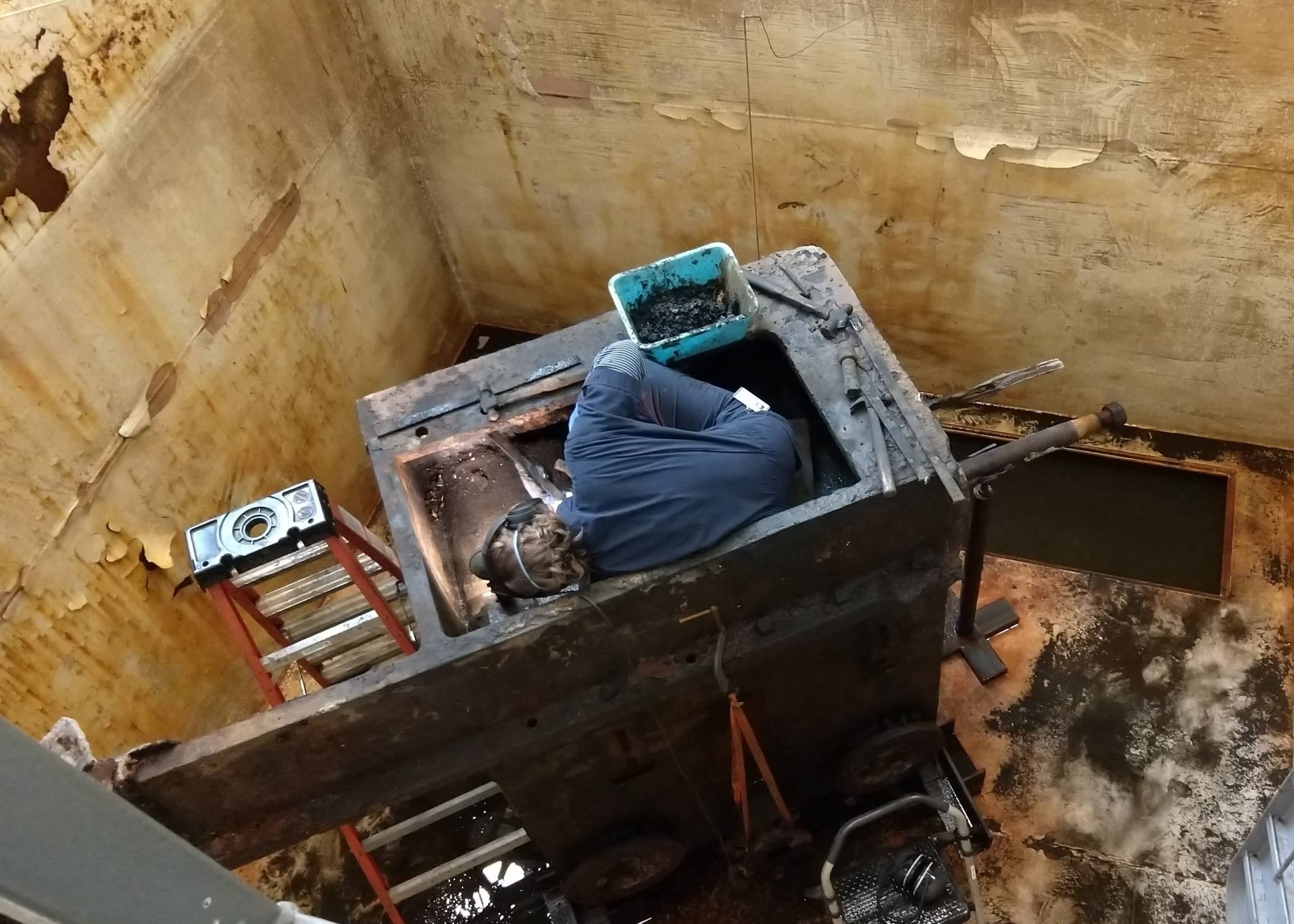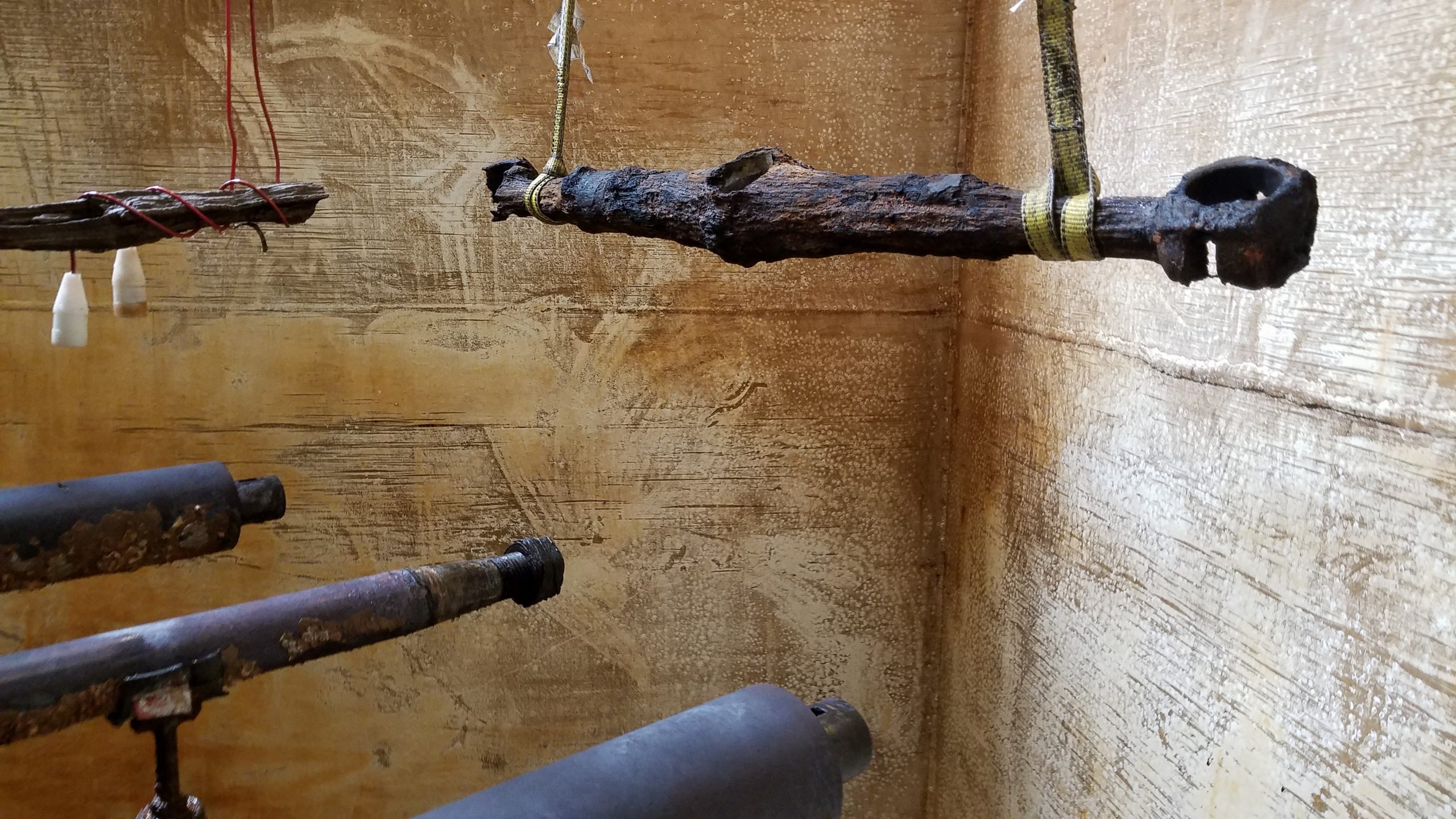After setting up electrolysis for the pumps in another tank, we took a longer break to catch up on other projects and got back in the condenser in November 2019. Our mission then was to remove further concretions from the bottom (currently top) of the condenser in view of separating the bed section of the current assembly. Yet another contraption was designed by Will and we were going to need flat and clean surfaces to get a good and secure grip on the bed for the separation process.