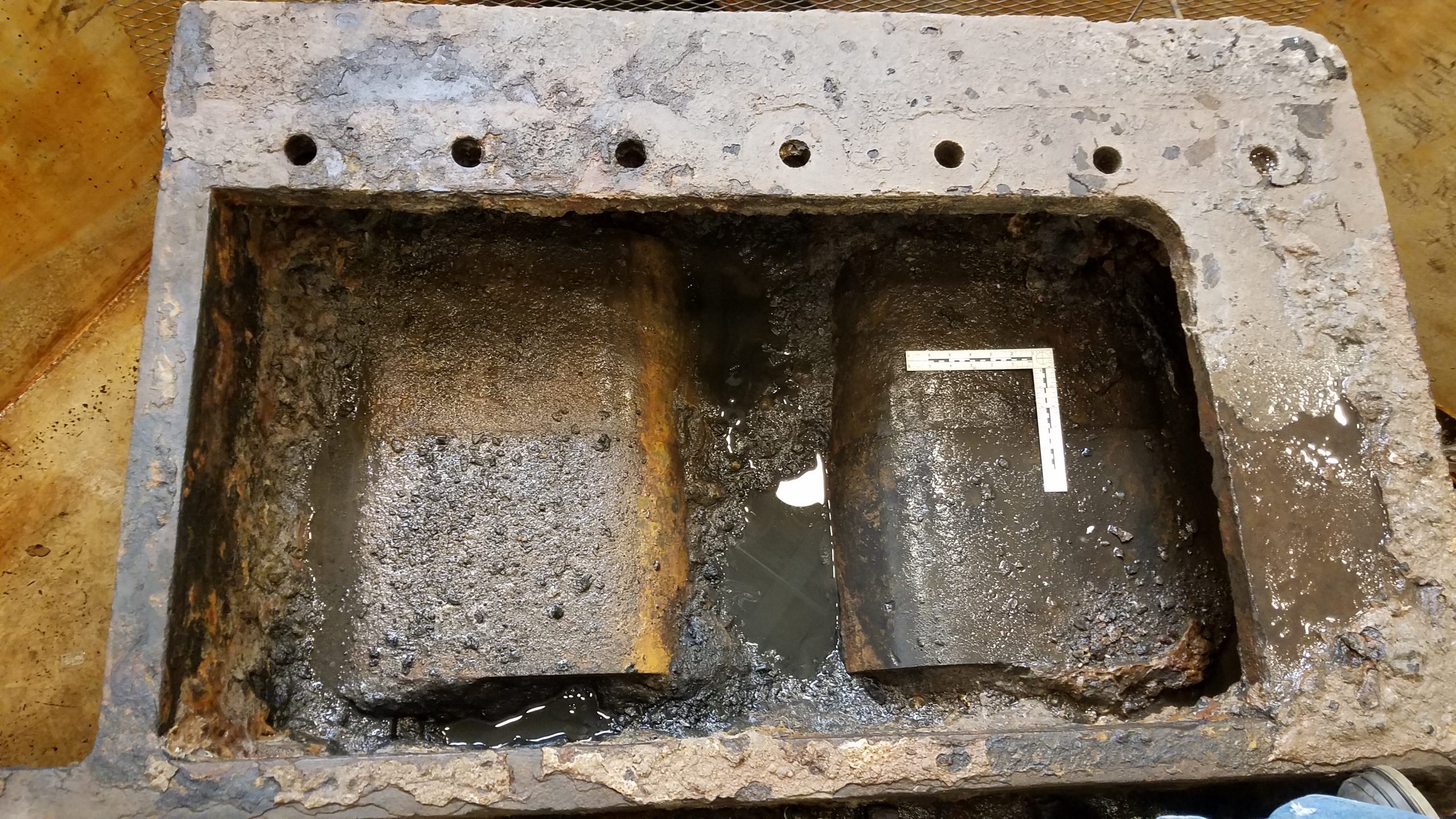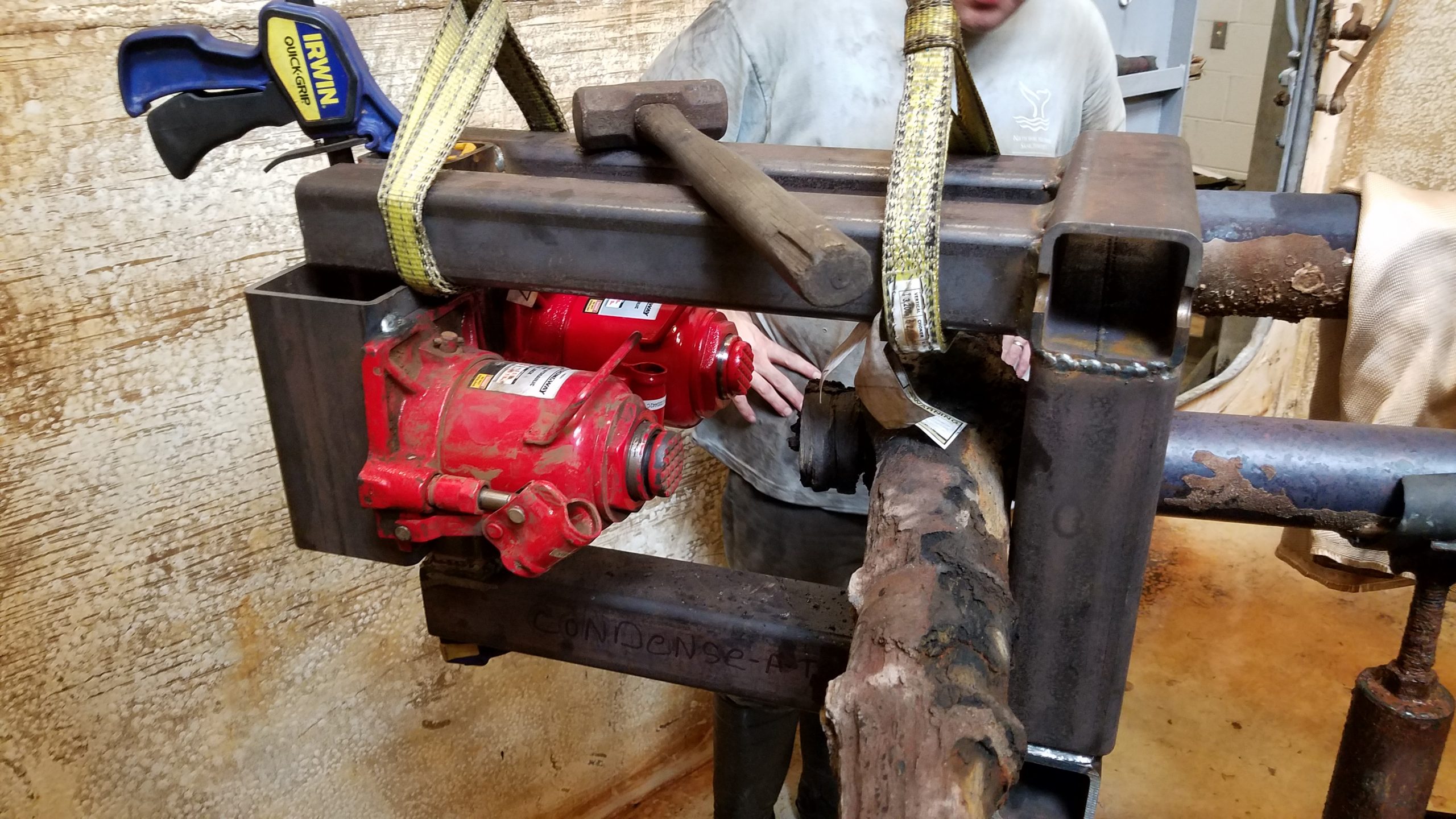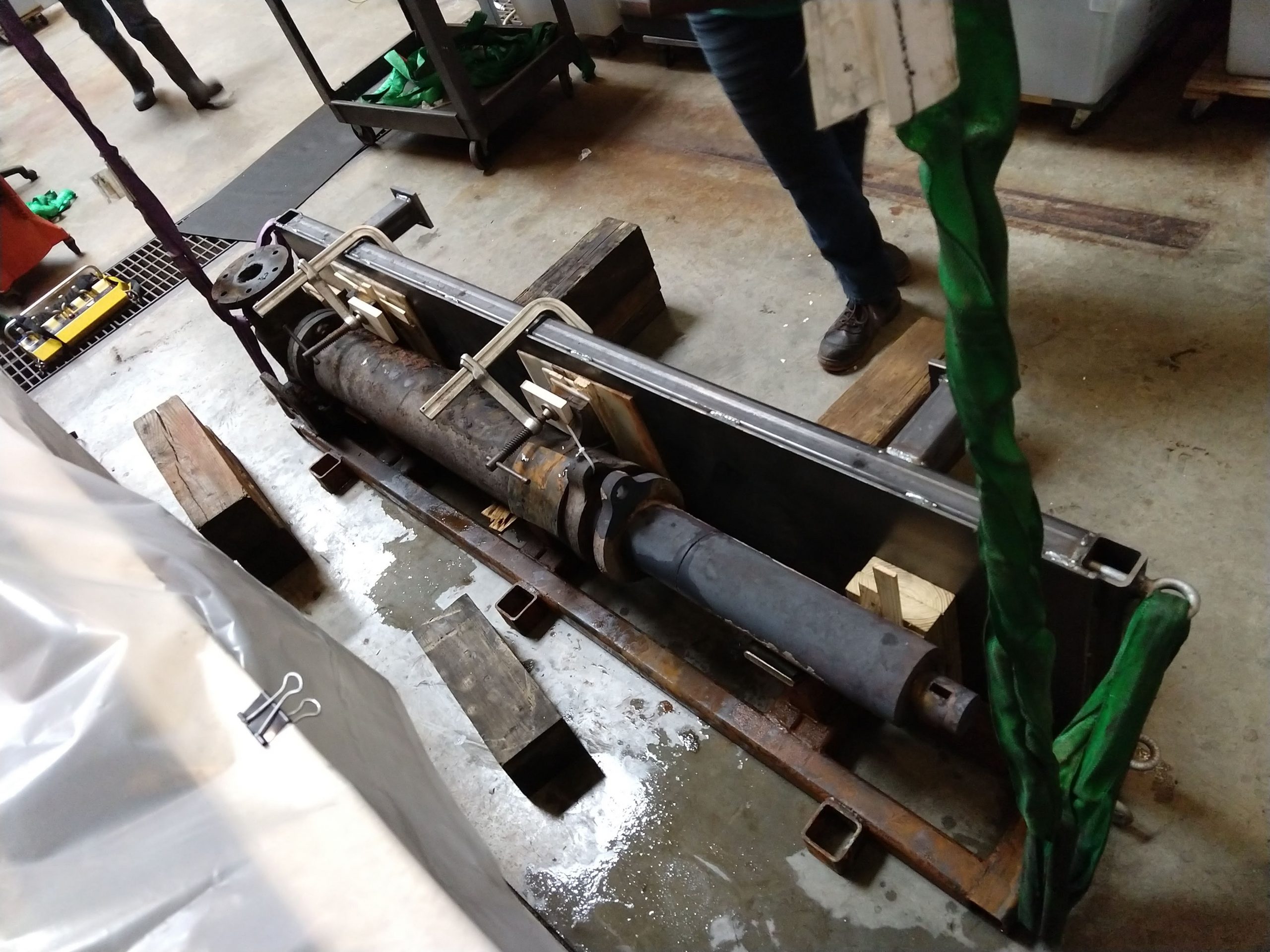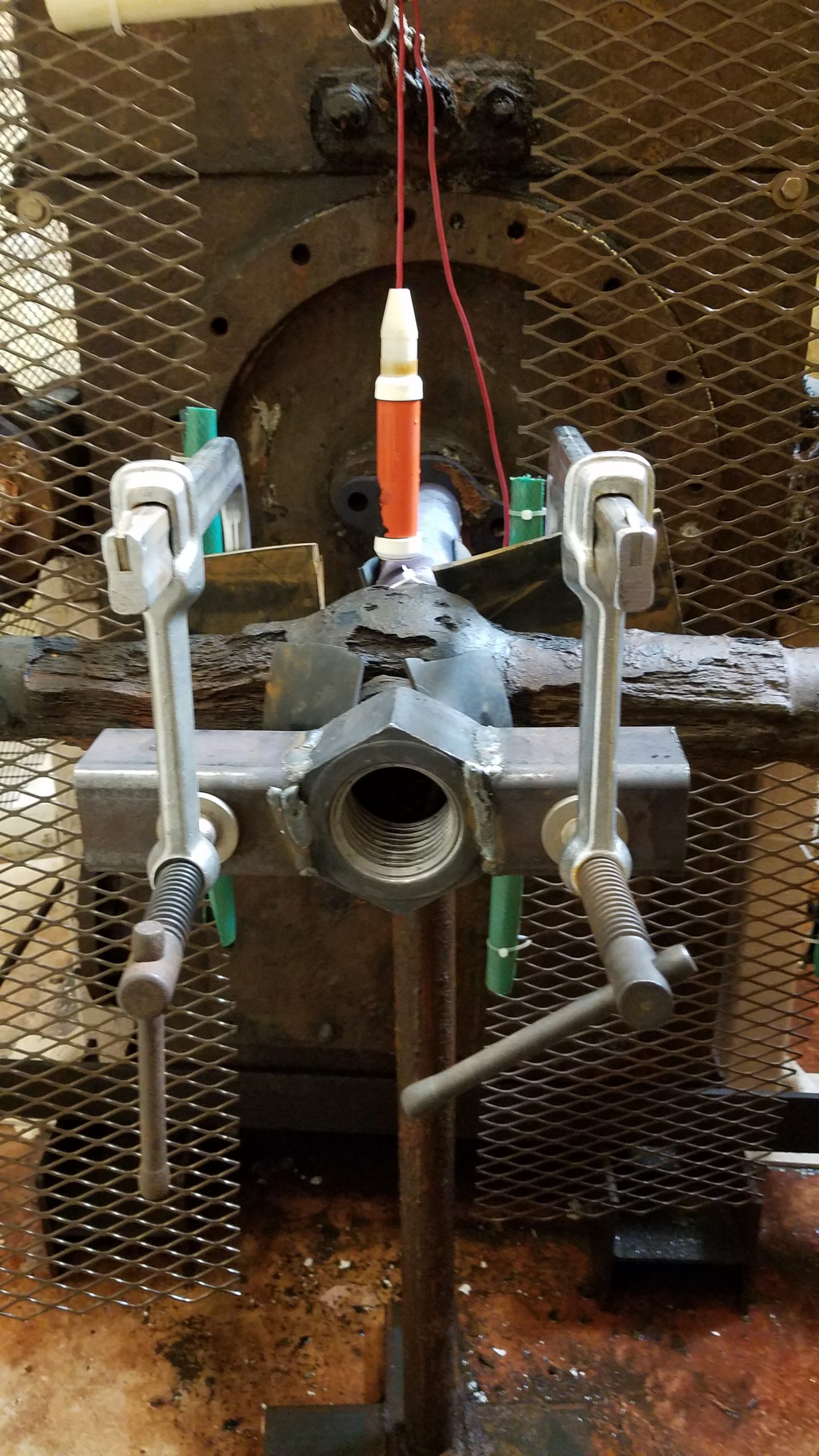 After setting up electrolysis for the pumps in another tank, we took a longer break to catch up on other projects and got back in the condenser in November 2019. Our mission then was to remove further concretions from the bottom (currently top) of the condenser in view of separating the bed section of the current assembly. Yet another contraption was designed by Will and we were going to need flat and clean surfaces to get a good and secure grip on the bed for the separation process.