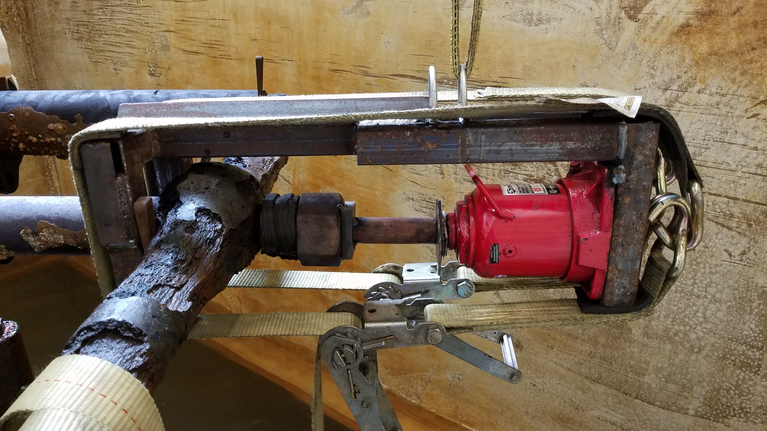 Except it was not! The process took about a week, 4 iterations of a welded contraption and two 40-ton capacity jacks. The following gallery of pictures gives a peek at the process: