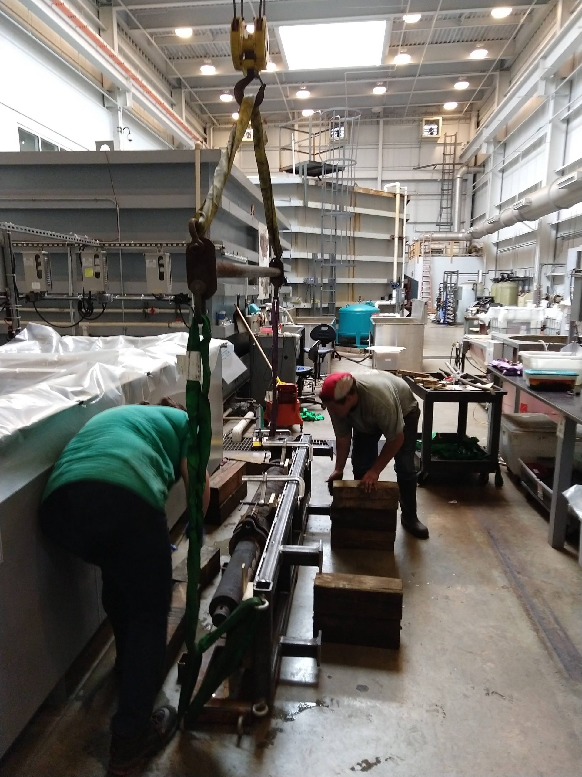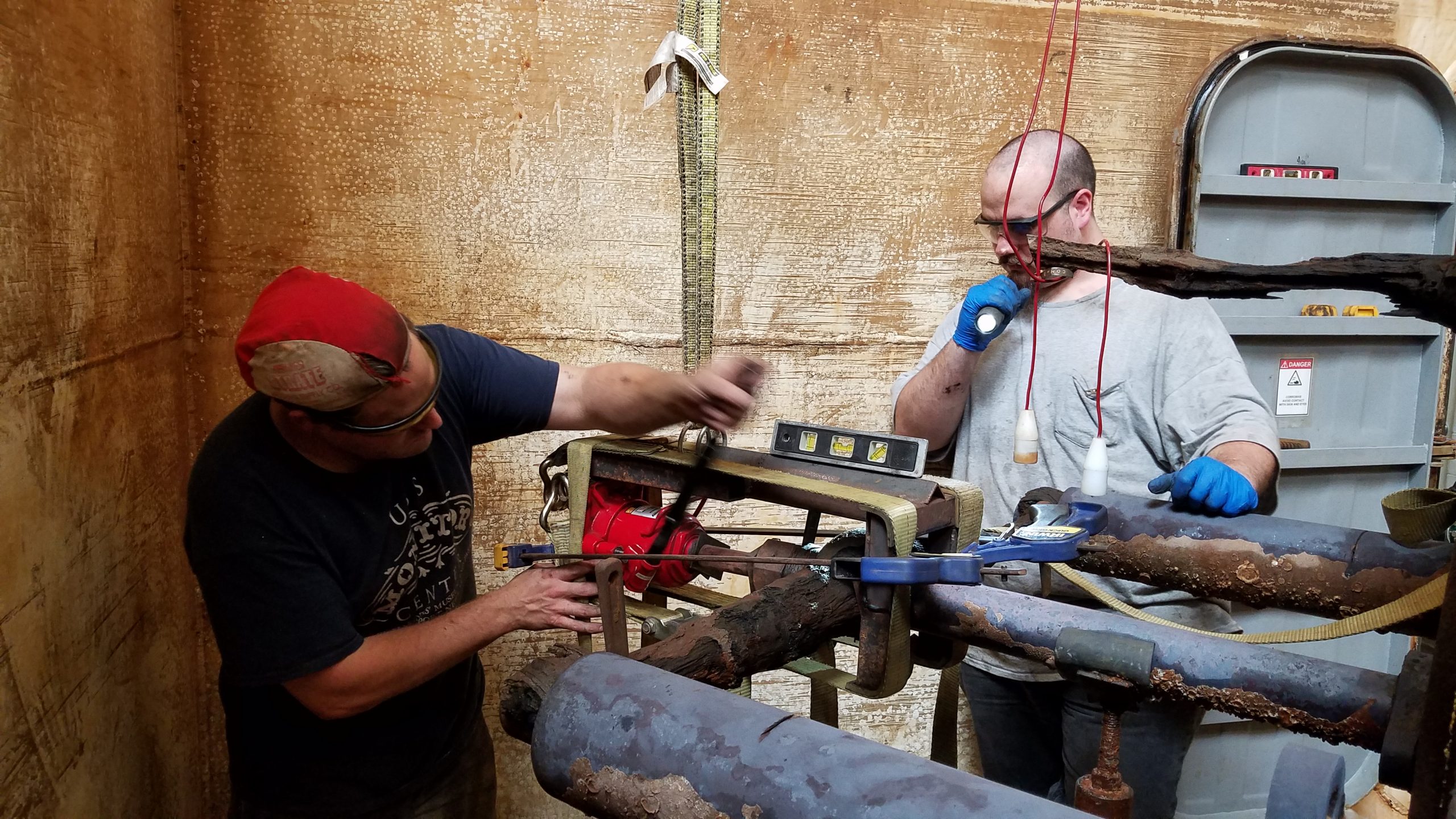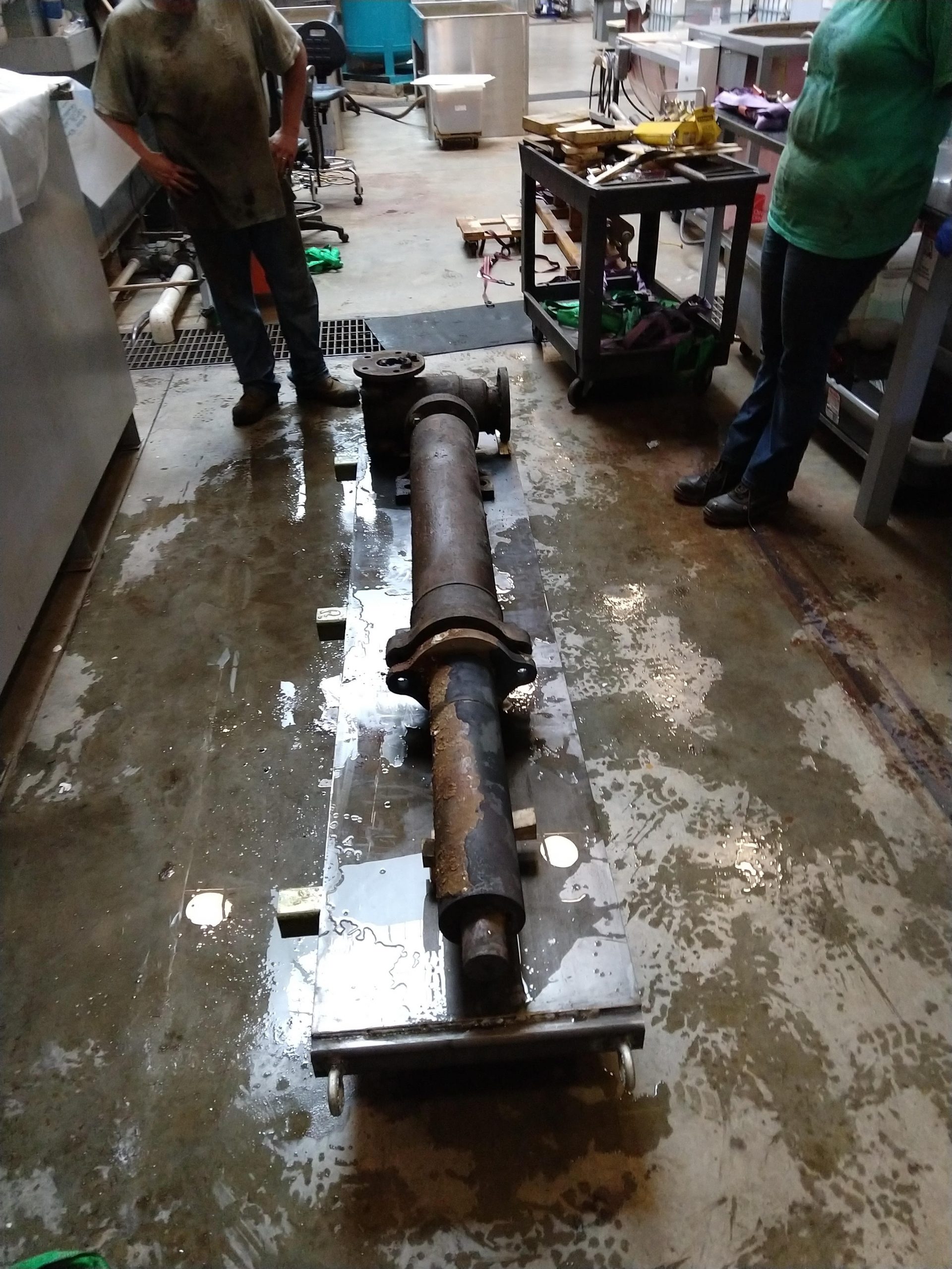 Following this success, we took a short break while Will was welding the next contraptions to safely remove the feed and water pumps from the side of the carriage. We had to remove them carefully and rotate them 90 degrees to assure physical stability. This meant that 3 supports had to be welded total: 1 to lift both pumps one after the other and 1 each for rotation and final support.