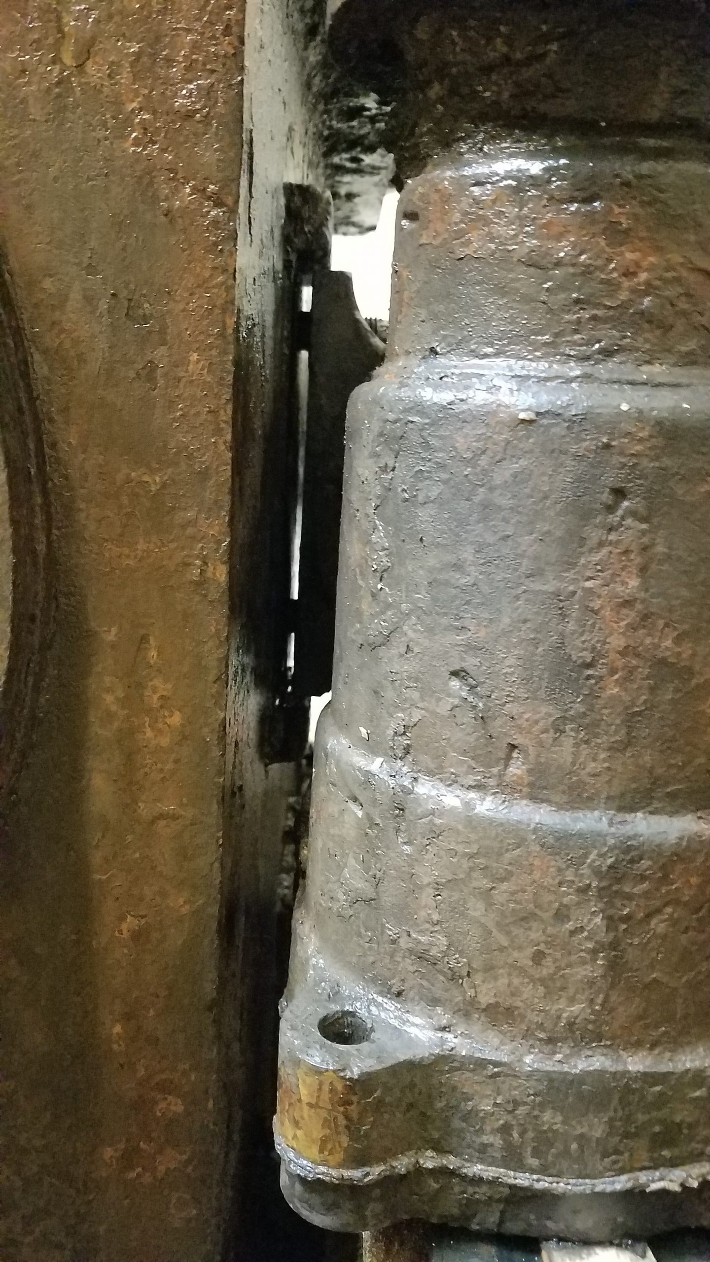 Considering that our ultimate goal is to get to the core of the problem… and eventually flip the condenser right side up and disassemble the mechanisms located inside the casing, both exterior pumps and the condenser bed (shown in orange in Fig. 1) need to be removed next. And the first step to take care of the pumps and bed was to remove the crosshead (Fig. 1 and 3). Sounds easy enough, right?!