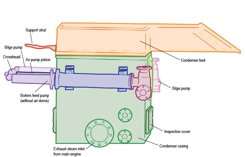 The condenser located on board Monitor is of the “common jet injection” or “contact” type (yes, there are multiple types!) Seawater is sprayed directly into incoming engine exhaust steam which is then condensed. The resulting mixture of condensate and seawater is then pumped by an air pump to the condenser hot wells where some is sent back to the ship’s boilers via a feed pump while excess is discharged overboard. The air pump and the hot wells are located in the condenser’s casing while the feed pump is attached to the exterior of the casing (Fig. 1; Hanley 2007). You still with me?!