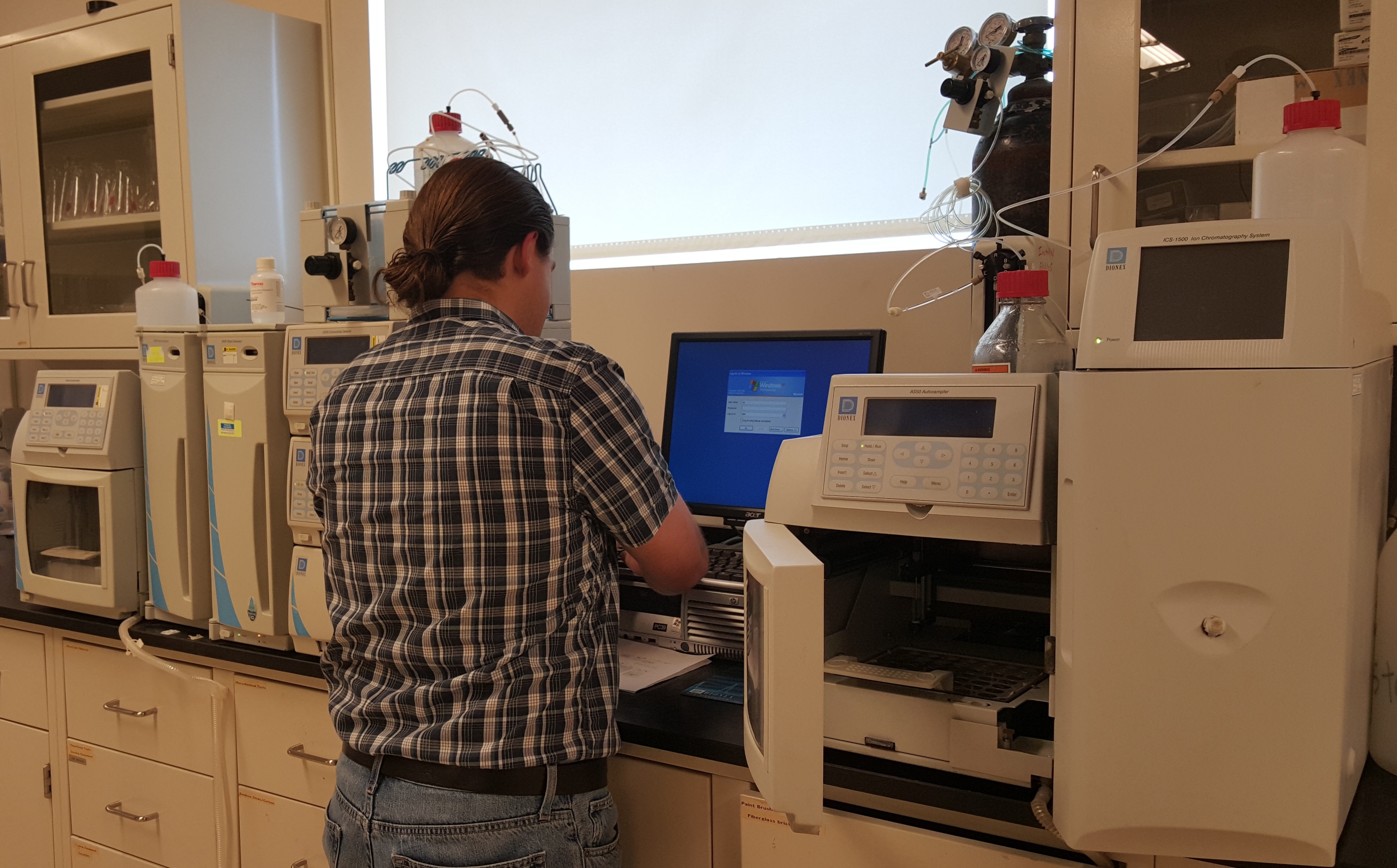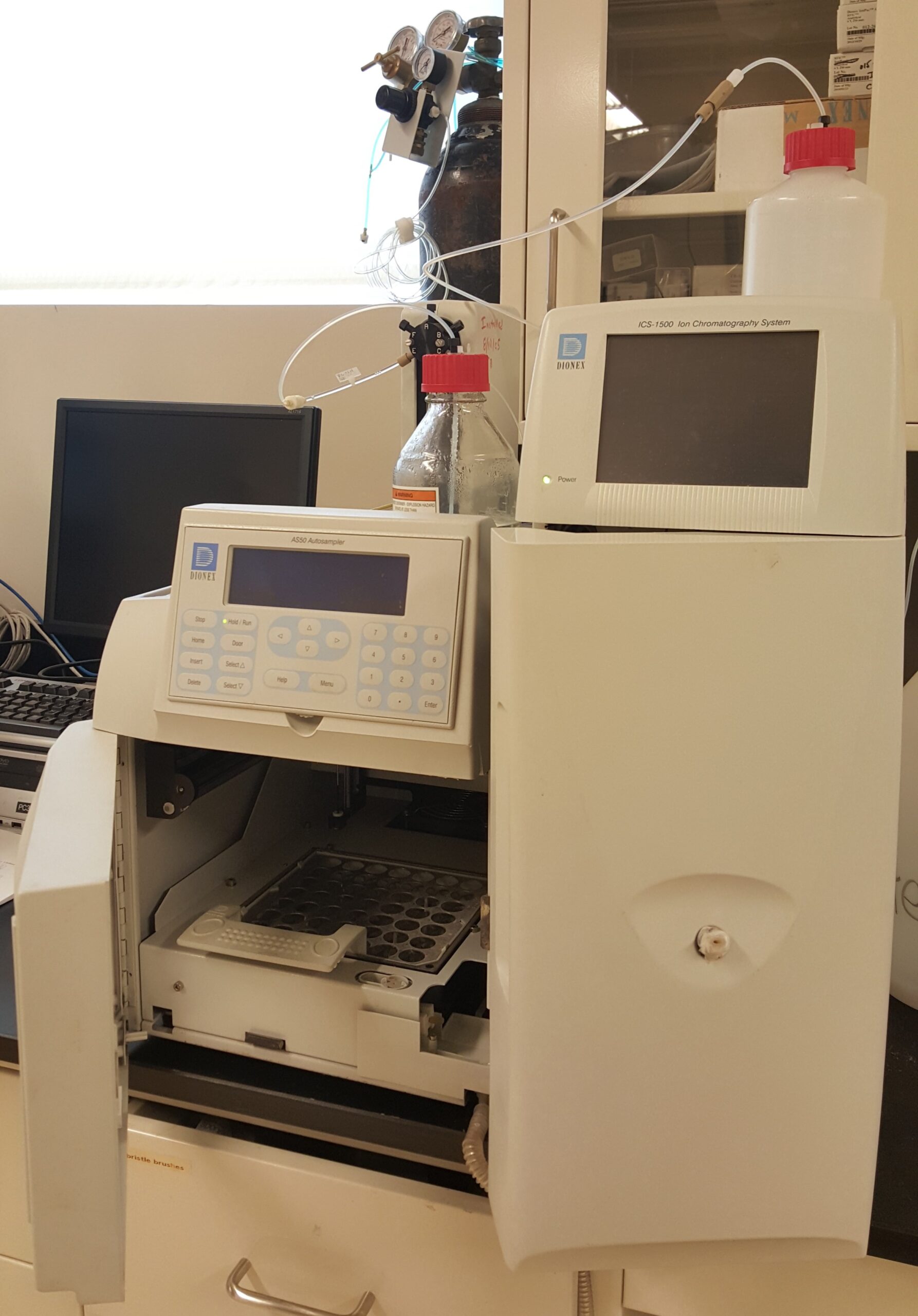 We have about 30 large tanks filled with high pH solutions and metallic artifacts in the lab (and MANY other smaller containers in other locations). Every trimester, the large tanks solutions are sampled and analyzed for the amount of salt present. We are actually very lucky to have an Ion Chromatograph (IC) that can analyze up to 40 samples at once for us (thanks to donations!). Without this apparatus we would have to undertake this analysis using titration for every sample which would most likely take up all of an employee’s time. The IC machine also allows us to re-run the samples as many times as we want. We love it!