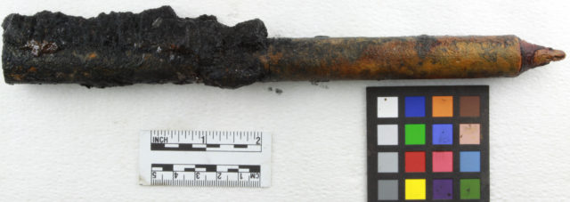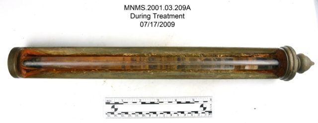The second reason is safety. The USS Monitor was outfitted with weapons and mercury-filled engine instruments. All of these were potentially dangerous during their life aboard the ship, however they still can be hazardous even today. With this in mind, we x-rayed a glass tube in order to determine if it contained mercury. The tube may have been from a pressure gauge and is entirely coated in corrosion and concretion. If it contained the heavy metal, it would look like a glow stick on the x-ray due to the metal’s density. We did not detect mercury, but will still handle it with care.