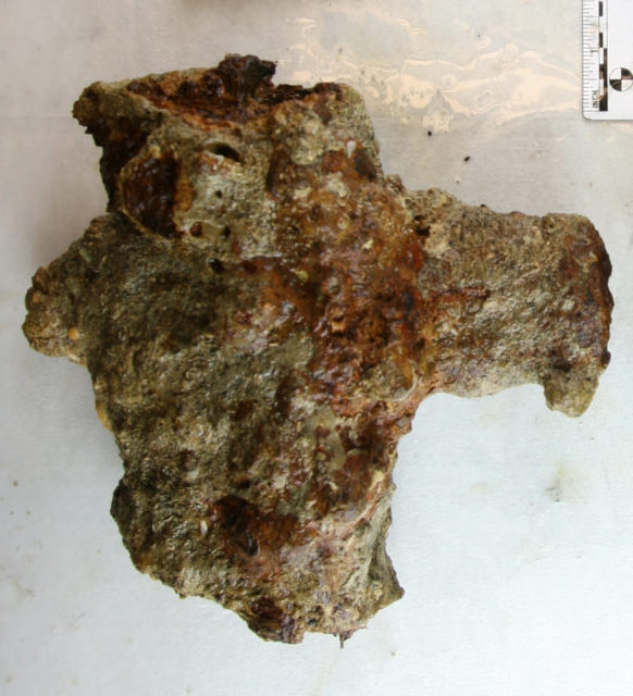 There are three reasons these particular objects were singled out. First is to determine the condition of the object. When artifacts are submerged in seawater they are covered in a cement-like aggregate called concretion. This is a mixture of metal corrosion products, sediment, and sea life, including mollusk and corals. Concretions can be a thin hard shell scattered across a surface or entirely encase a group of objects in an amorphous lump. By x-raying these concretions we can: