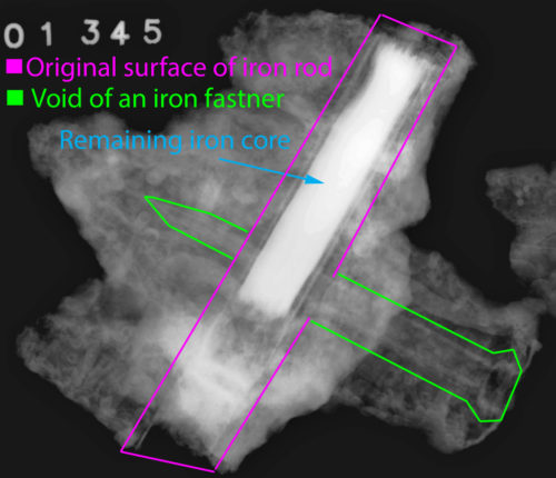 - To provide technological and manufacturing information of ship components. X-rays can reveal things like difficult to read maker’s marks and internal fittings. We can use these insights to research where these parts came from and how they were constructed.