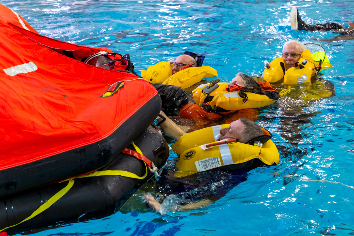 The second part of the course is a full day (8 a.m. – 5 p.m. ET) of practical training. You will be updated with the latest information on key topics and then spend most of the day in hands-on training covering damage control, firefighting, emergency signaling, survival equipment, use of personal flotation devices, and life rafts.