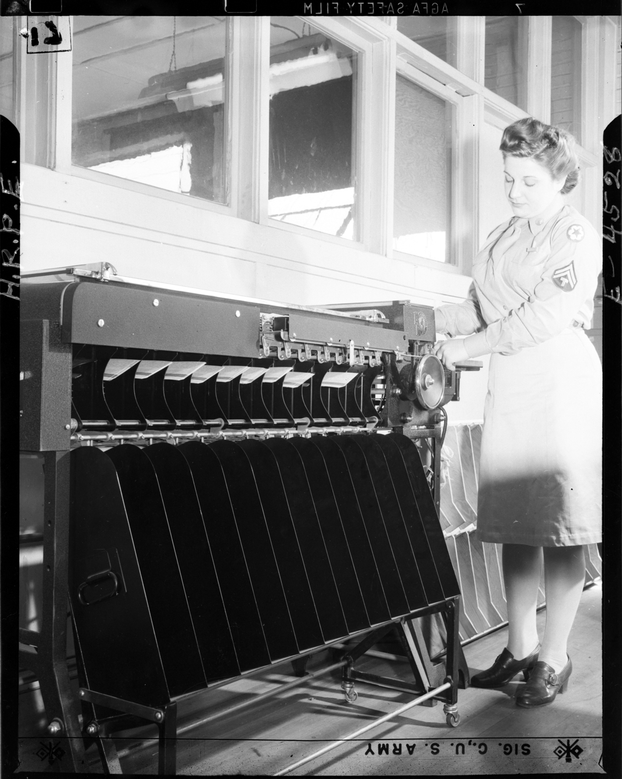 The Women’s Army Corps (WAC) was formed in 1942; originally it was the Women’s Army Auxiliary Corps (WAAC), but it was converted to active duty status in 1943. This made WACs unique to other women’s military groups, because it was the first time, and the only group, that integrated women into the United States Military. Around 150,000 women volunteered to serve in the WAC during World War II. Women were not allowed to fulfill ‘active combat’ roles in the military, but that still left over 250 support roles in the army to step into, from stenographer to map maker, photographer to truck driver, mechanic to switchboard operator. All of these positions were vital to the war effort. Many of the women who joined the WAC had a relative or sweetheart already serving, and hoped to bring their loved ones home sooner by aiding in the war effort.
